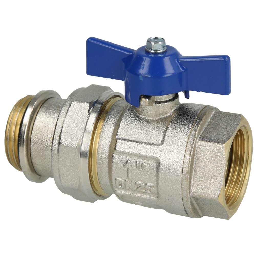 Der Verteilerkugelhahn mit Verschraubung ist geeignet für Wasserversorgungs-, Heizungs- und Klimaanlagen. Der blaue Flügelgriff besteht aus Aluminium und der Körper aus vernickeltem Messing.