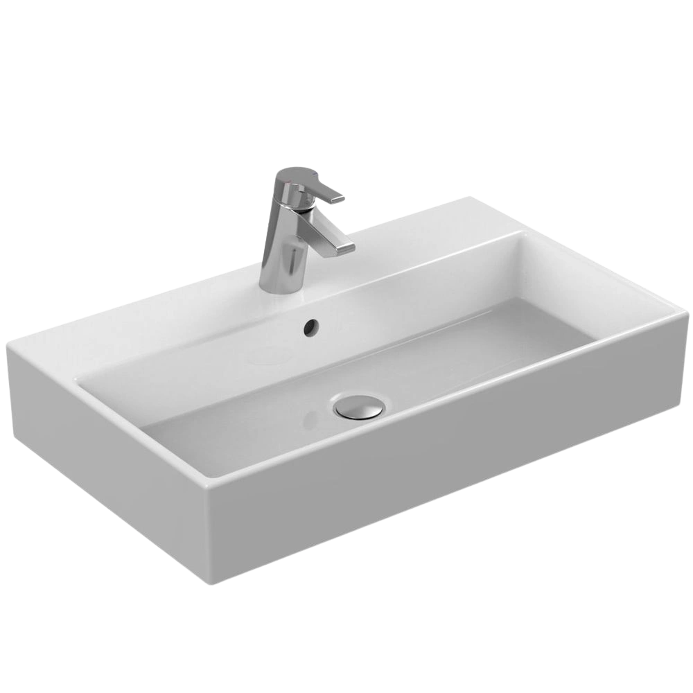 Waschtisch mit schmalen Kanten und großzügigem Innenbecken. Die Hahnlochbank bietet Platz für eine Armatur und ausreichend Ablagefläche außerdem wird überschüssiges Wasser durch den integrierten Überlauf abgeleitet.