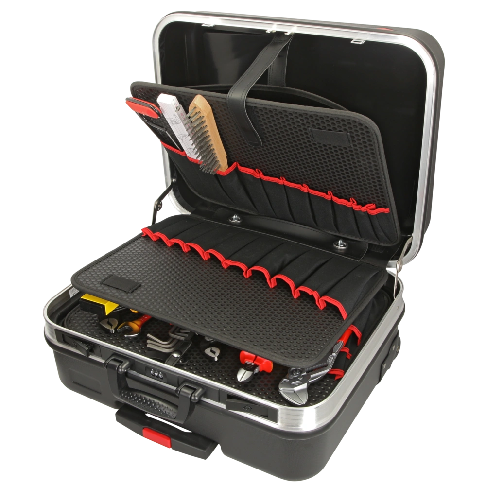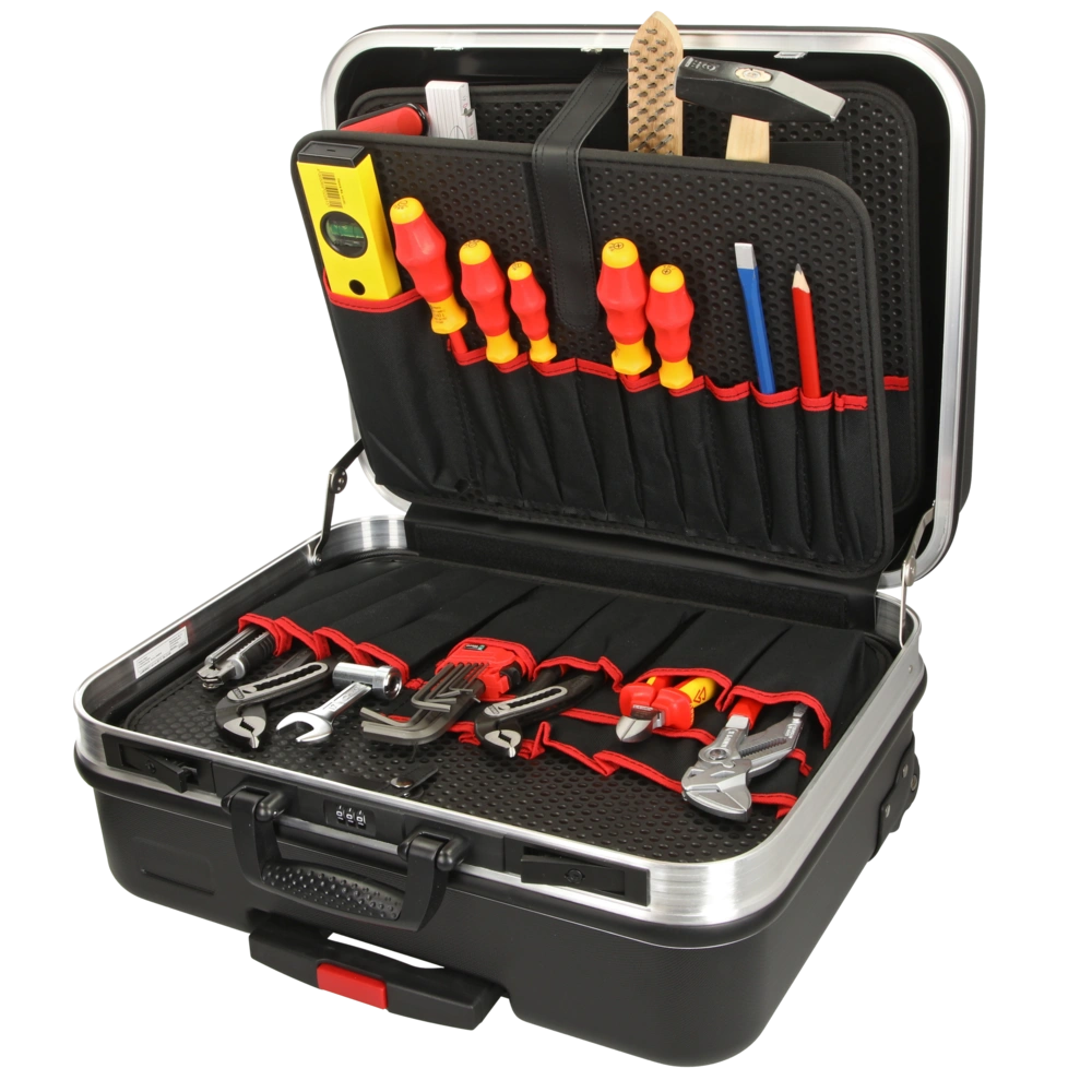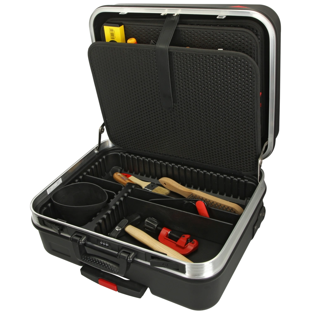 Werkzeugkoffer BIG Basic Move mit 31 qualitativ hochwertigen Markenwerkzeugen für den täglichen Einsatz im Sanitär-, Heizungs- und Klimabereich. Die Werkzeuge für Arbeiten unter Spannung sind VDE-geprüft nach DIN EN 609000. Die beiden bestückten Werkzeugtafeln sind herausnehmbar. Die Bodenschale lässt sich durch Steck-Einsätze in bis zu 6 Bereiche für verschiedene Werkzeuge oder Ersatzteile unterteilen. Der Koffer aus strapazierfähigem ABS-Kunststoff hat einen stabilen umlaufenden Aluminiumrahmen und robuste Metallscharniere. Zur Ausstattung gehören ein integriertes Dokumentenfach, Kippschlösser und ein Zahlenschloss. Mit seinem ausziehbaren Teleskopgriff und den leichtlaufenden Skater-Rollen wird der Koffer im Handumdrehen zum praktischen Trolley. Durch das Beschriftungsfeld und zwei Aufkleber lässt sich der kompakte Begleiter leicht personalisieren.
