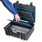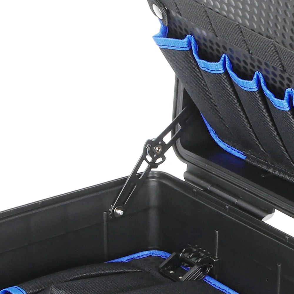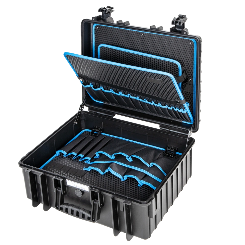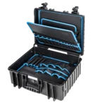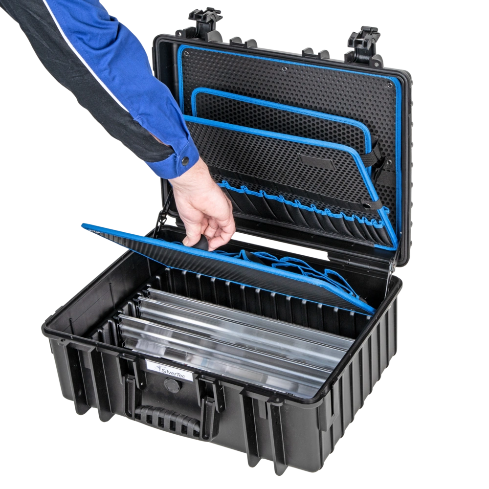 Stabiler Koffer aus Polypropylen zum Transport und zur Aufbewahrung von Werkzeug. Im Inneren befinden sich vier Werkzeugtafeln mit Werkzeugtaschen und elastischen Werkzeughalterschlaufen. Durch das...