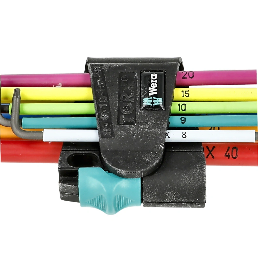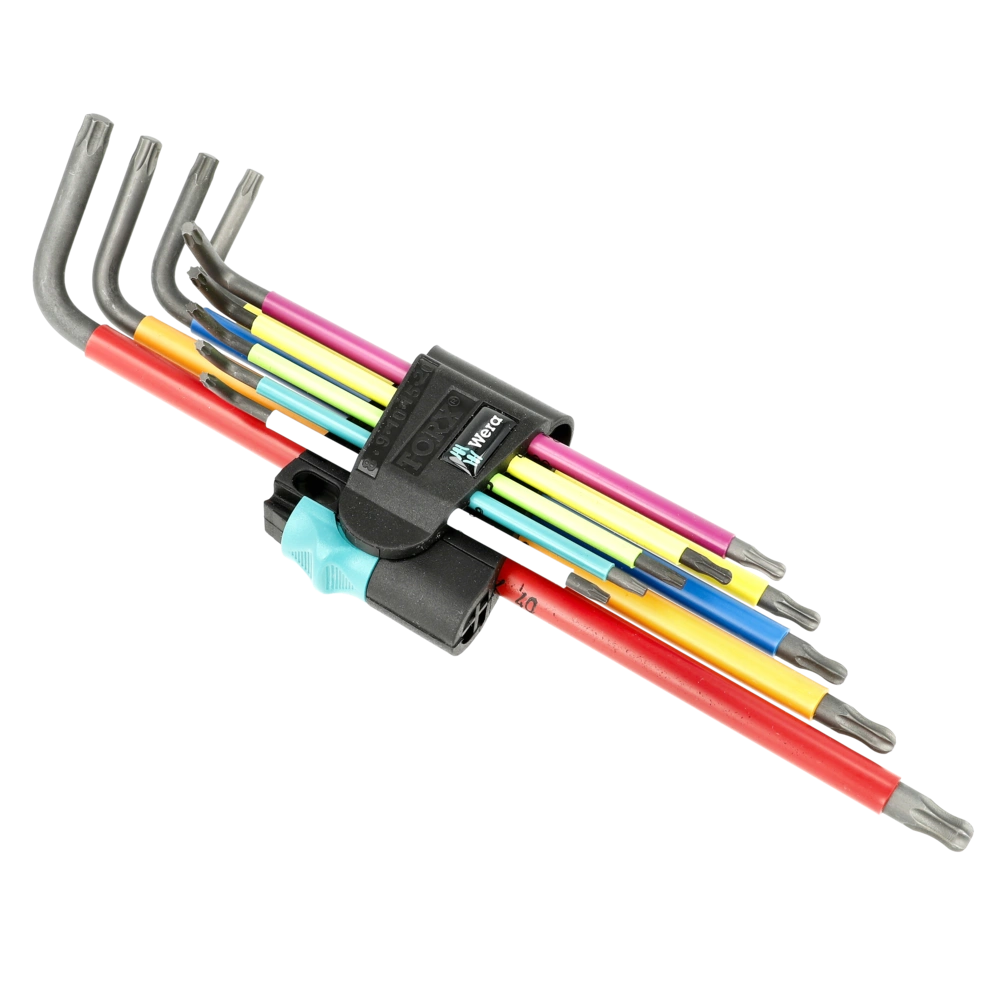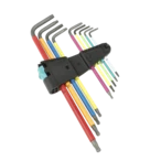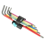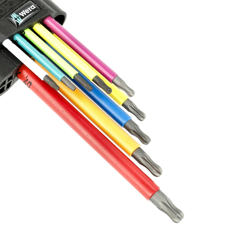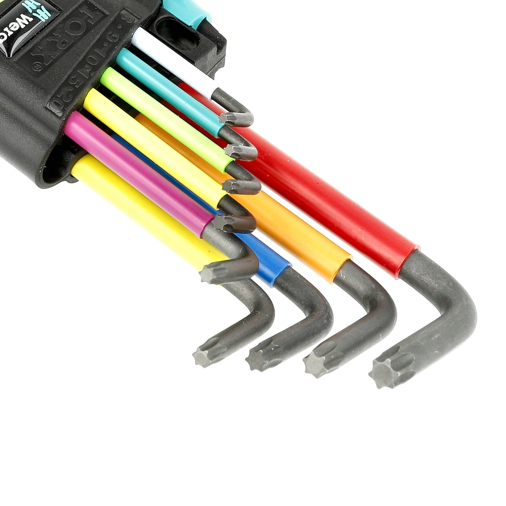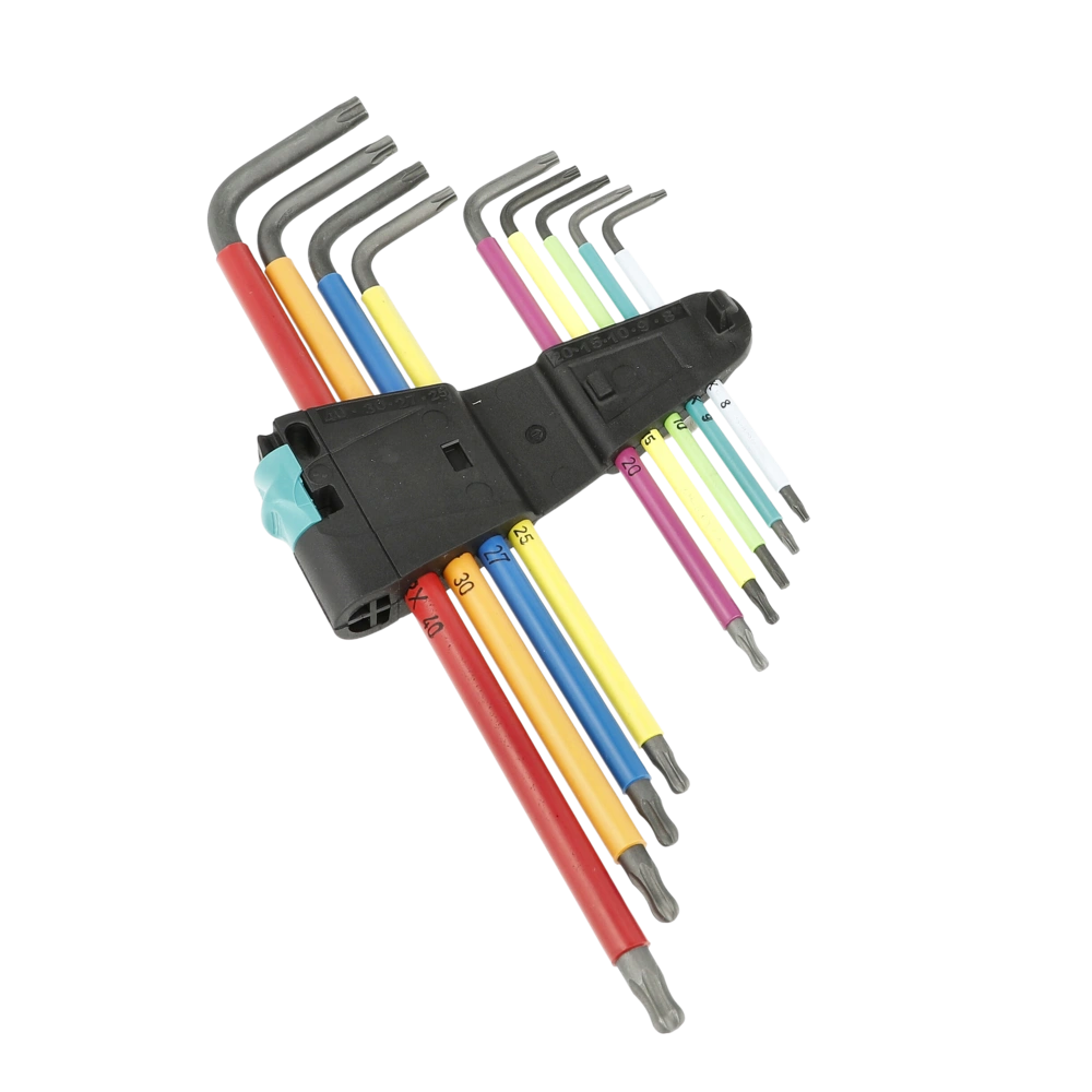 Der Winkelschlüsselsatz für Innen-TORX®-Schrauben beinhaltet 9 Winkelschlüssel, die mit dem Farbkennzeichnungssystem "Take it easy" Werkzeugfinder ausgestattet sind. Alle Winkelschlüssel haben an der langen Schenkelseite eine Kugel, um auch an schwierigen Einbaulagen bequem schrauben zu können, da Sie den Schlüssel nicht senkrecht in den Schraubenkopf stecken müssen. Alle Winkelschlüssel haben eine Kunststoffummantelung, um auch bei niedrigen Temperaturen angenehm arbeiten zu können. Eine spezielle BlackLaser-Oberflächenbehandlung schützt ihr Werkzeug vor Korrosion und trägt zu einer langen Lebensdauer bei. Geliefert werden die Winkelschlüssel in einem praktischen Clip aus verschleißfreiem Material. Für einen dauerhaften und sicheren Halt!