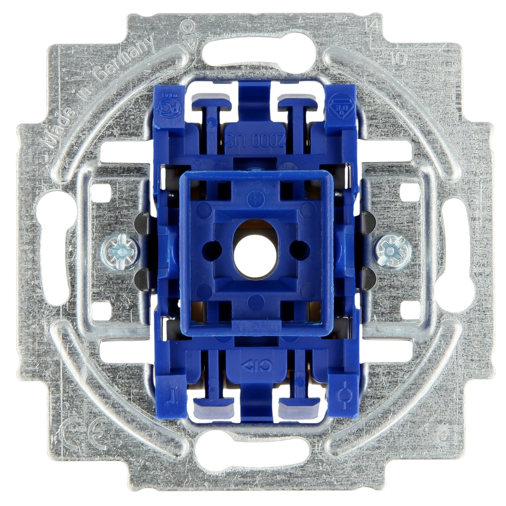 1-poliger Wipptaster-Einsatz mit N-Klemme für Aus- und Wechselschaltungen zur Unterputz-Installation. Der Einsatz ist als Öffner (Ruhestrom) oder Schließer (Arbeitsstrom) verwendbar.