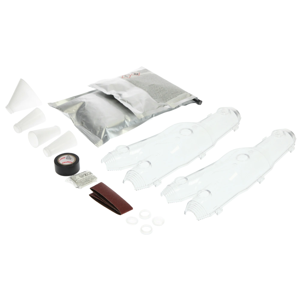 Muffe zum wasserdichten Verbinden von Leitungen mit PVC-, PE-, VPE- und EPR-Isolierungen. Die Muffe ist für Press- und Schraubverbinder mit Aluminium- und Kupferkabeln geeignet und kann im Innenraum, Freiluft, im Erdreich und im Wasser eingesetzt werden. Sie ist halogenfrei, wasserdicht und gegen chemische Einflüsse, Erdalkalien und UV- Strahlung beständig. Die transparente Formschale mit großer Einfüllöffnung besteht aus schlagfestem Kunststoff. Das hydrolysebeständige, hochwertige 2-Komponenten-PUR-Gießharz lässt sich sauber und leicht verarbeiten.