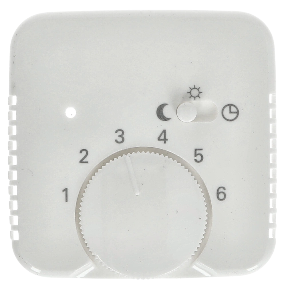 Zentralscheibe mit Drehknopf, Schiebeschalter für die Nachtabsenkung und Aufdruck als Bedienelement für Raumtemperaturregler-Einsätze.