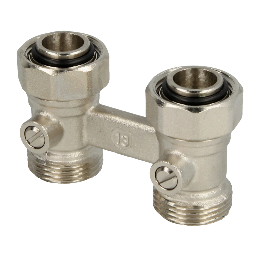 Der Zwei-Rohr-Hahnblock in gerader Form besteht aus vernickeltem Messing. Der Anschluss für den Heizkörper ist 3/4" und der Anschluss für das Rohr beträgt 3/4" Eurokonus, der Abstand zwischen den Anschlüssen beträgt 50 mm.