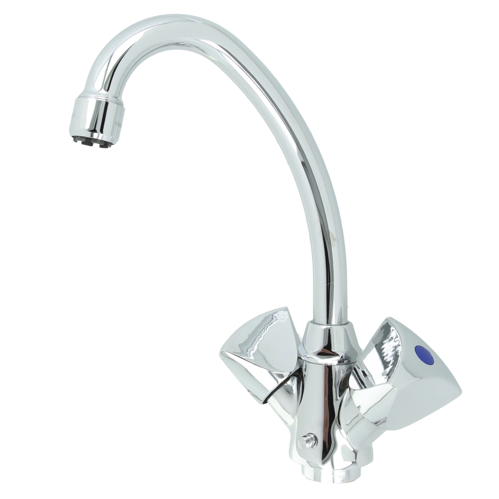 Zweigriff-Waschtischarmatur für die Einlochmontage. Die Armatur ist mit Dreikanthaubengriffen und einem schwenkbaren HU-Rohrauslauf mit Strahlregler ausgestattet. Die flexiblen Anschlussschläuche erleichtern die Montage.