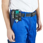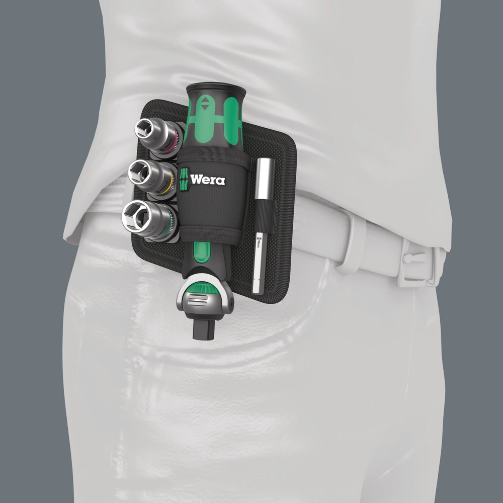 Kompakte Zyklop-Knarre mit magnetischer Aufnahme für 1/4" Bits und 3/8" Nüsse. Der auf 0, 15 und 90° arretierbare Kopf ermöglicht den Einsatz des Werkzeugs als Knarre und Ratschen-Schraubendreher. Im Griff ist ein schwenkbares Bit-Magazin integriert, so sind die Bits schnell zur Hand und gehen nicht verloren. Das Set im praktischen, texilen Halfter kann am Gürtel befestigt werden.