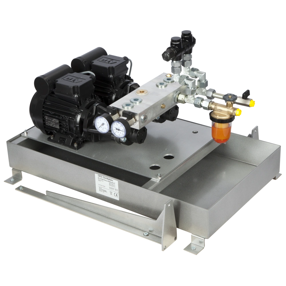 OEG-Zubringeraggregat für Heizöl EL auf pulverbeschichteter Ölauffangwanne, Heizölfilter, Alu-Steuerblock samt integrierter Rückschlagventile,