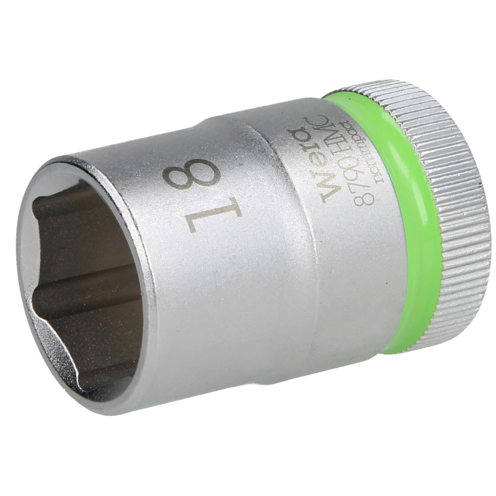 Socket for the use in manual and power tool operations. The socket is equipped with "Take it easy" size colour coding to find the required size easily and fast. It has ball stop grooves and is suitable for hexagon head screws and nuts.