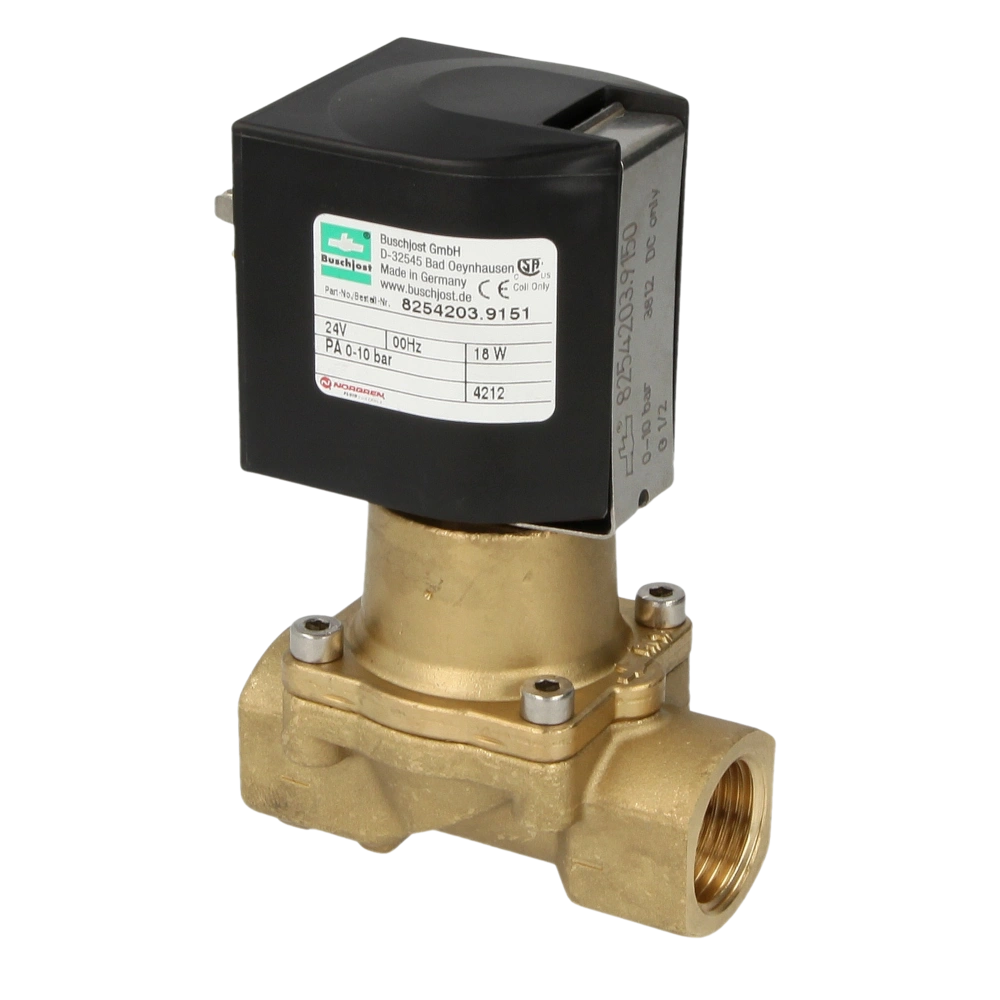 Compact solenoid valve with closing damping and FPM seal for oils and fuels. The valve is force pilot operated without differential pressure and, therefore, suitable for vacuum and systems with low or fluctuating pressure conditions.