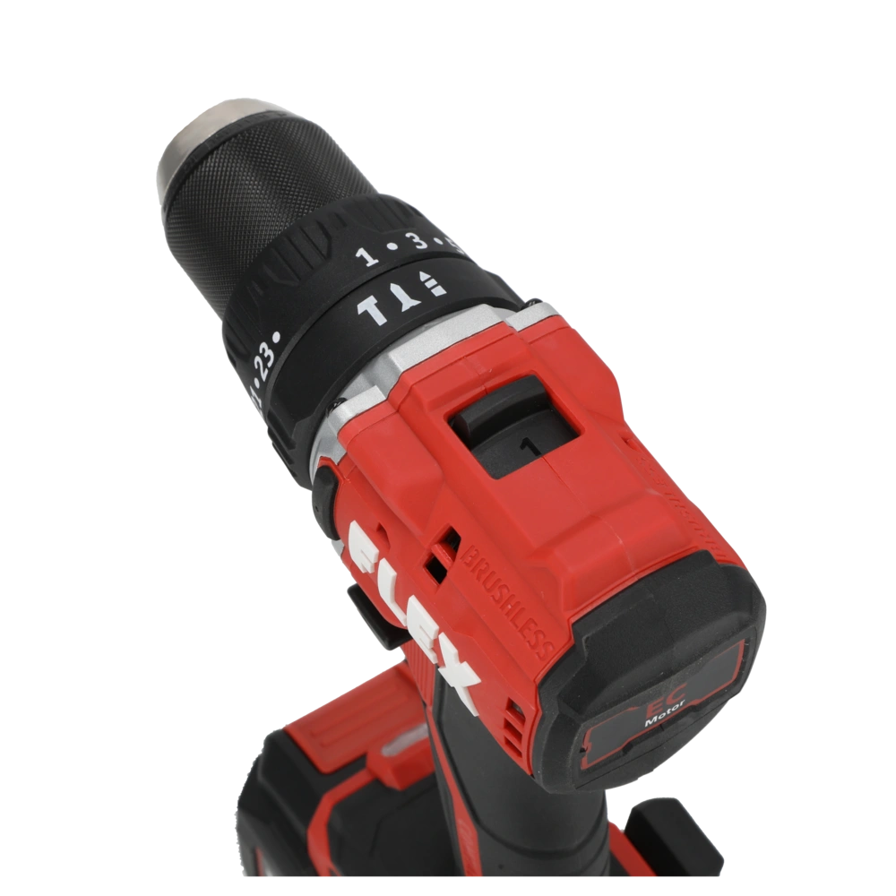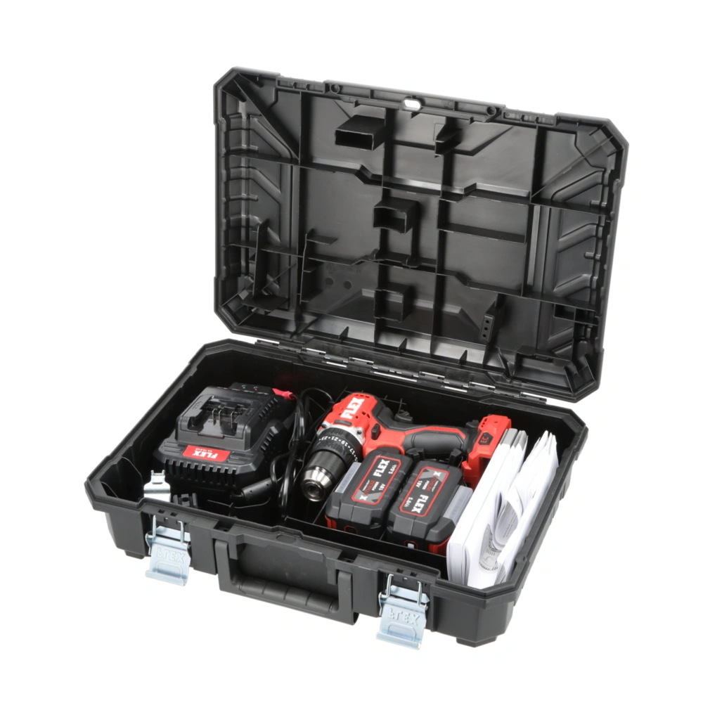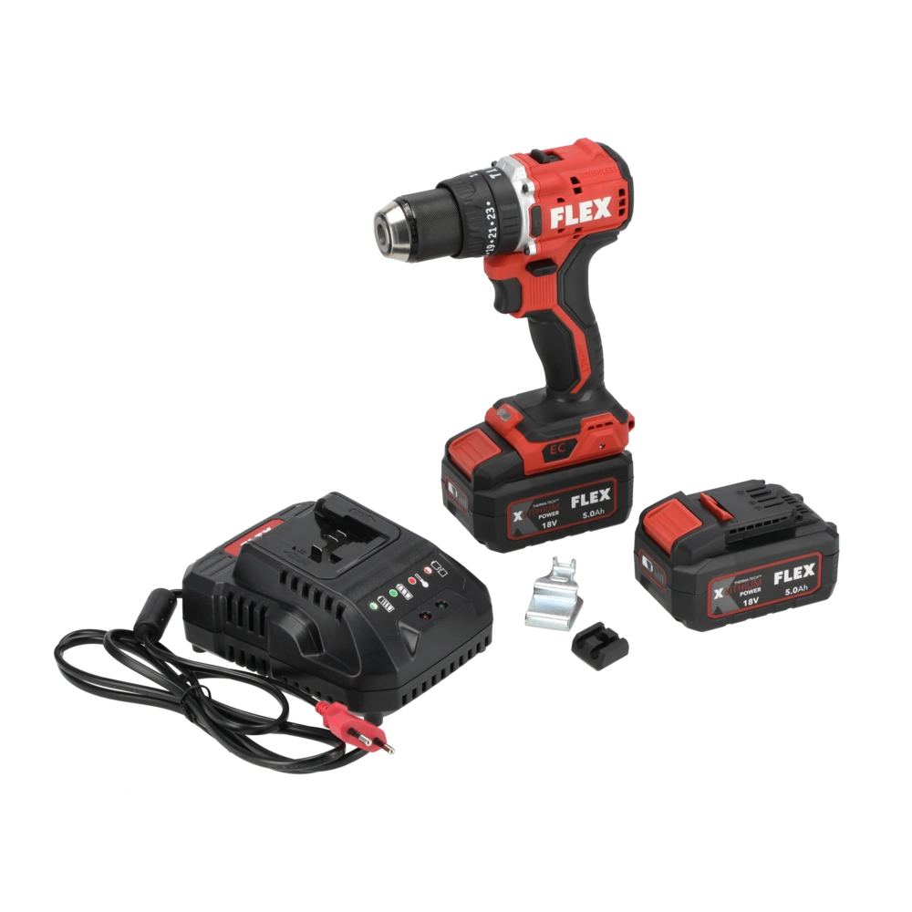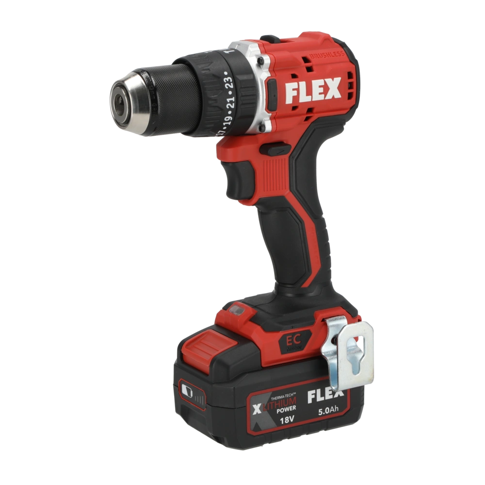 With the belt clip and on-board bit storage you always have your most important accessories to hand. The combi drill runs on all 18 V FLEX batteries and is supplied with two batteries, charger and carrying case – ready to go straight into action.
