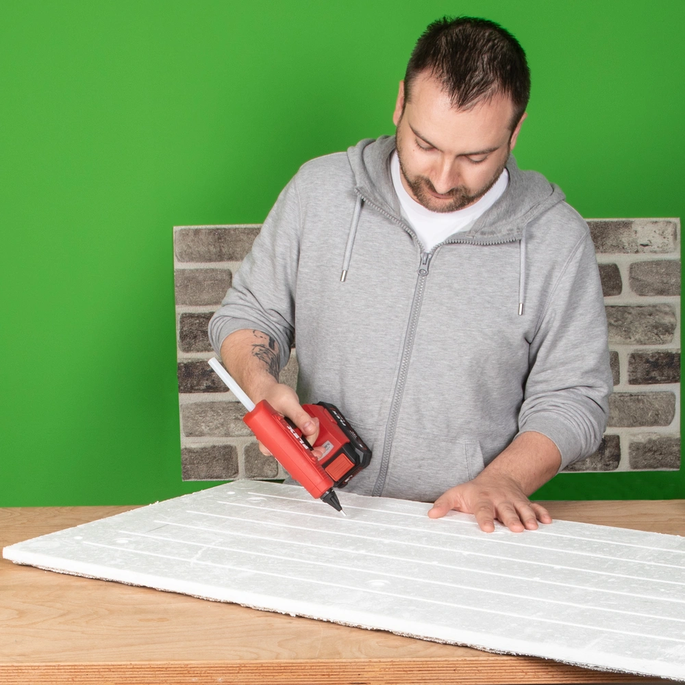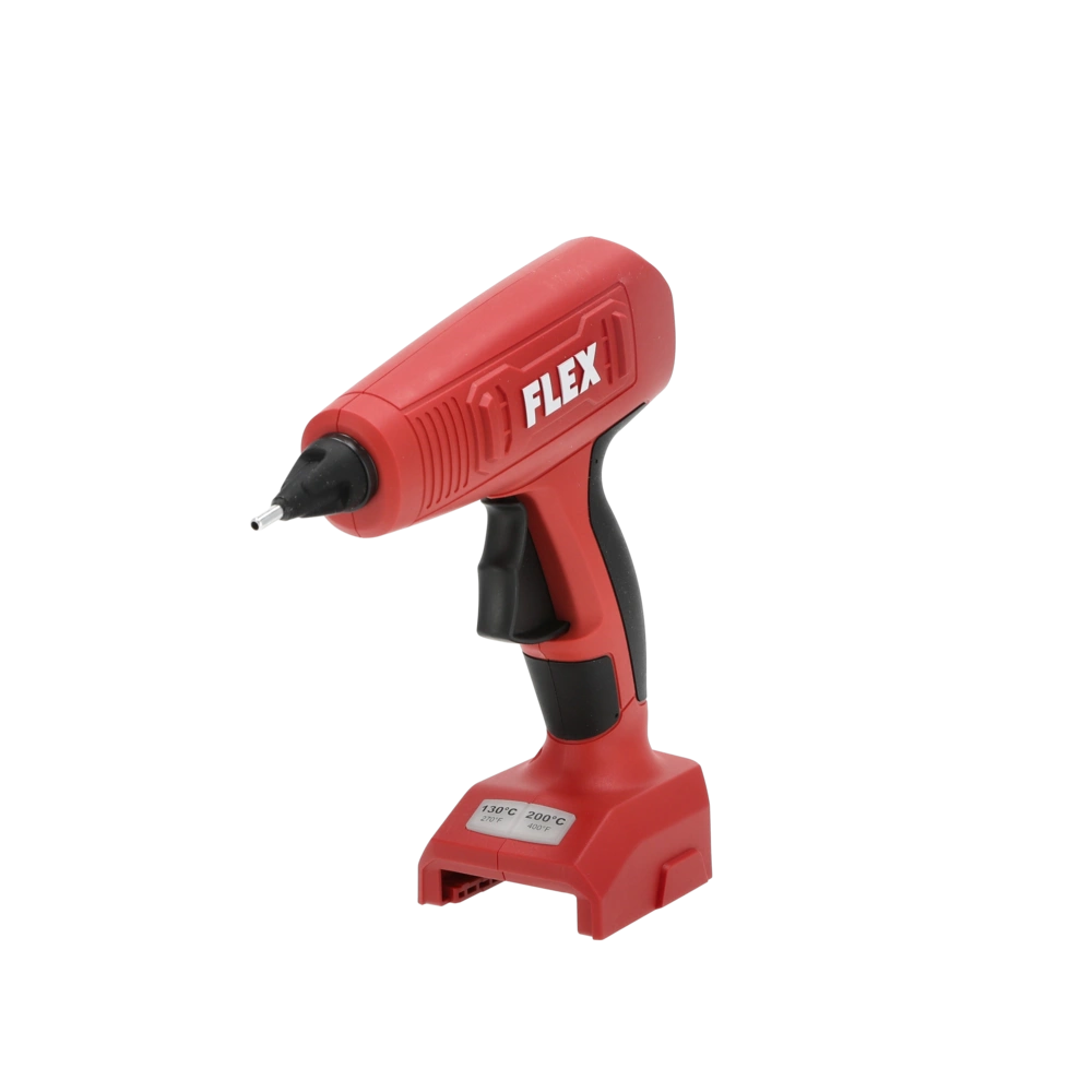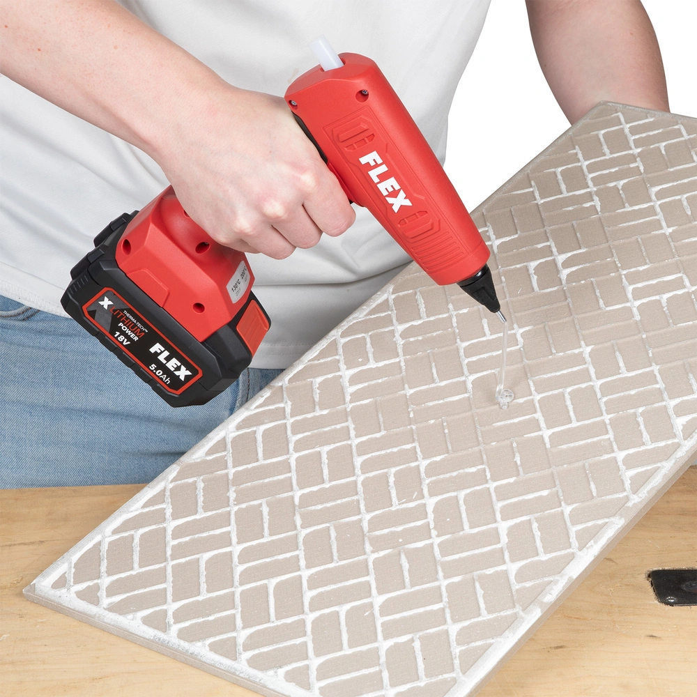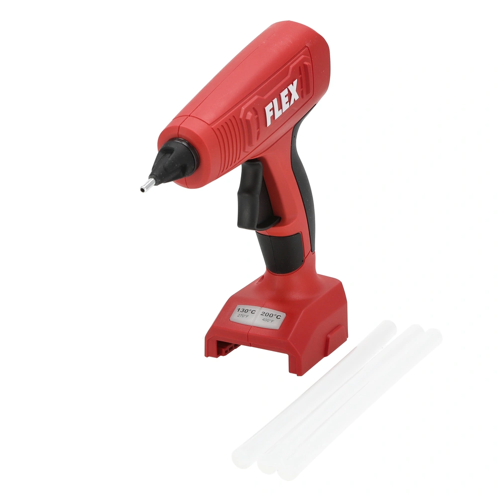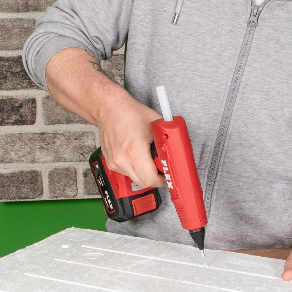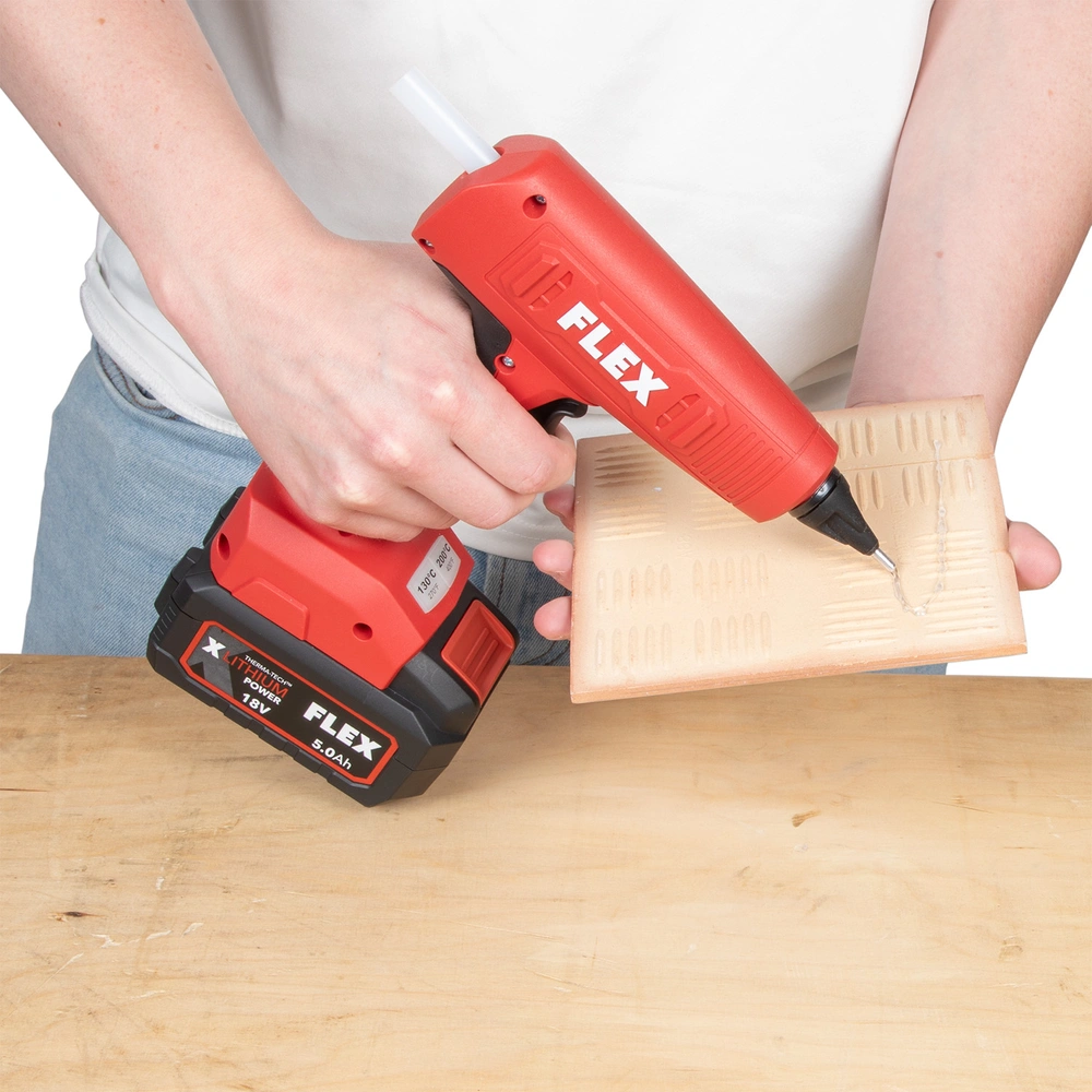 The hot-glue gun can be operated with all FLEX 18V battery packs and is supplied including nozzle and glue sticks.