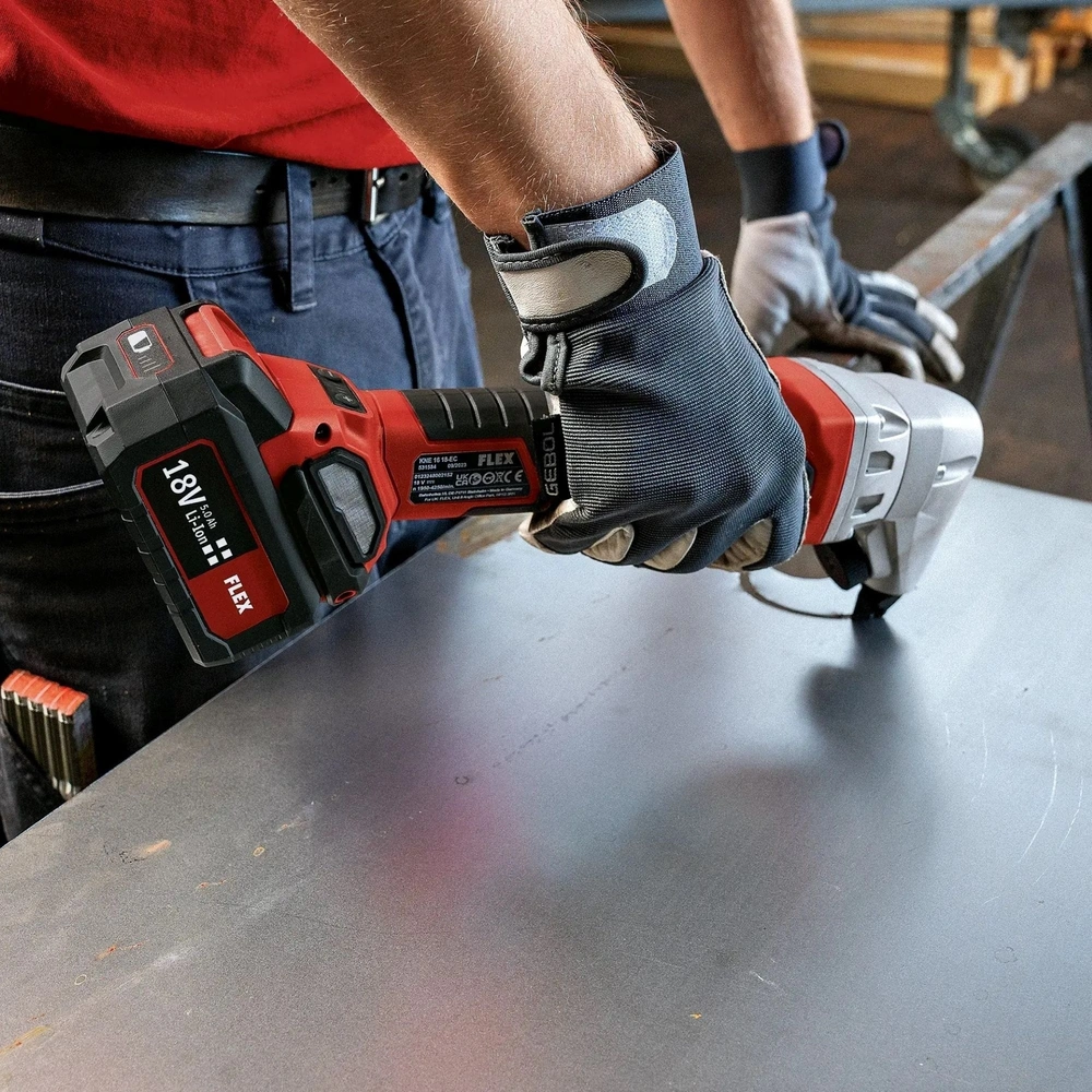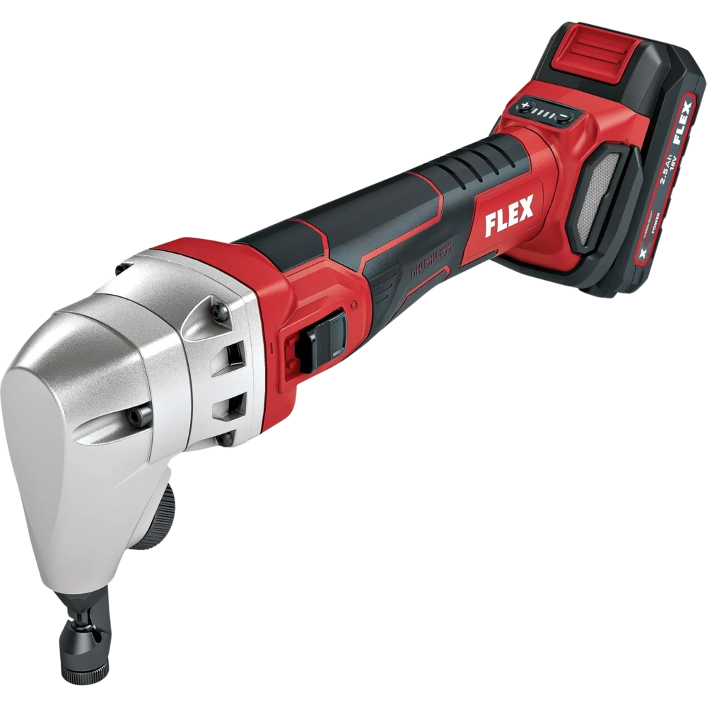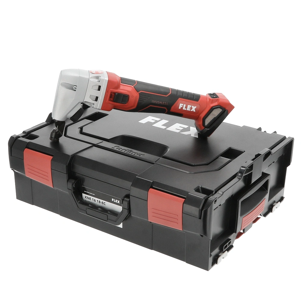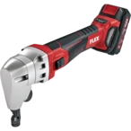 All product information Scope of deliveryBattery-operated nibbler for distorsion-free separating and cutting in flat and shaped metal sheets. The tool provides a good curve mobility for notches and internal cut-outs with radii from 24 mm. The cutting direction can be adjusted quickly and tool-free in 45° increments. The sheet nibbler has a powerful, brushless motor, an on/off switch with lock and a battery capacity display. Thanks to the streamlined, ergonomic handle section with soft-grip inlays, it can be operated fatigue-free. Safe working is ensured due to the 4-step speed preselection. Smooth start, overload protection, restart lock and automatic shutdown in case the tool is blocked.