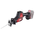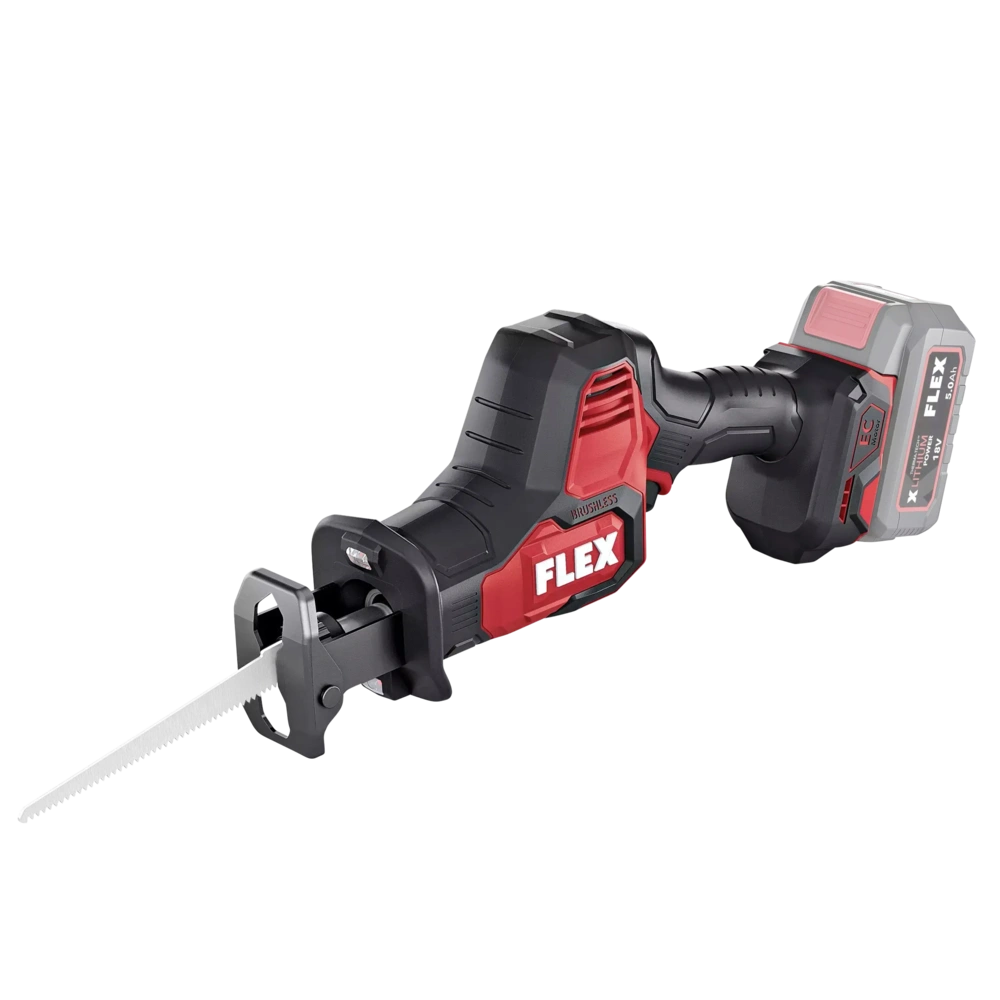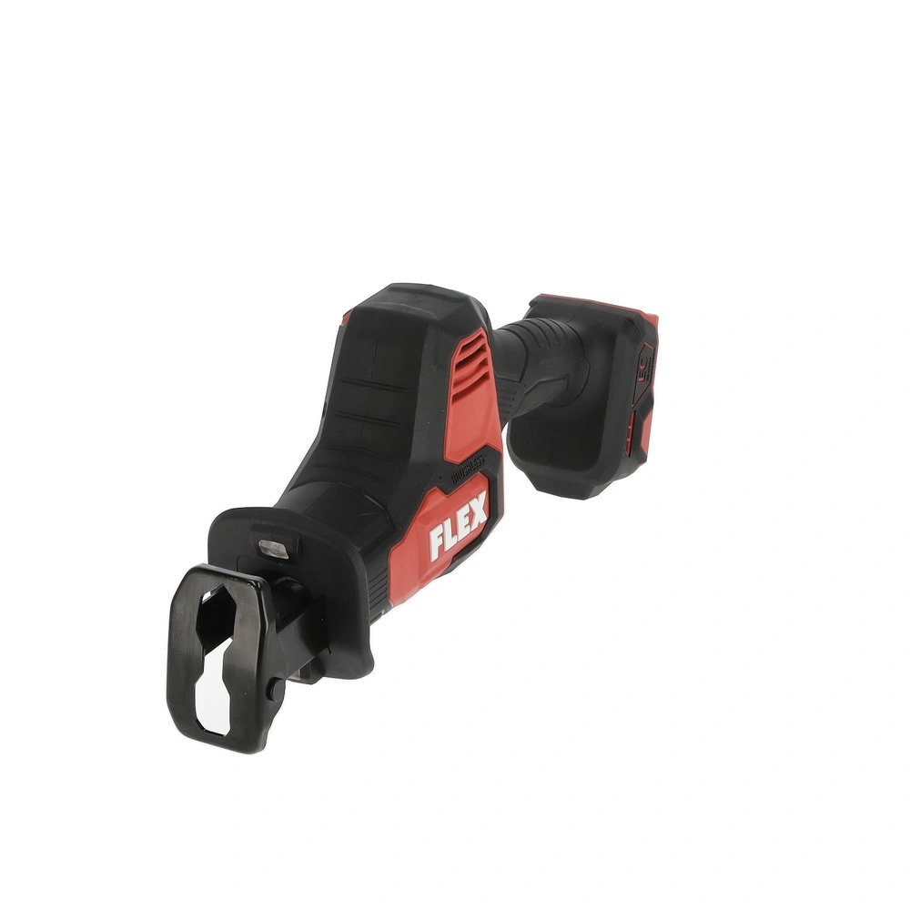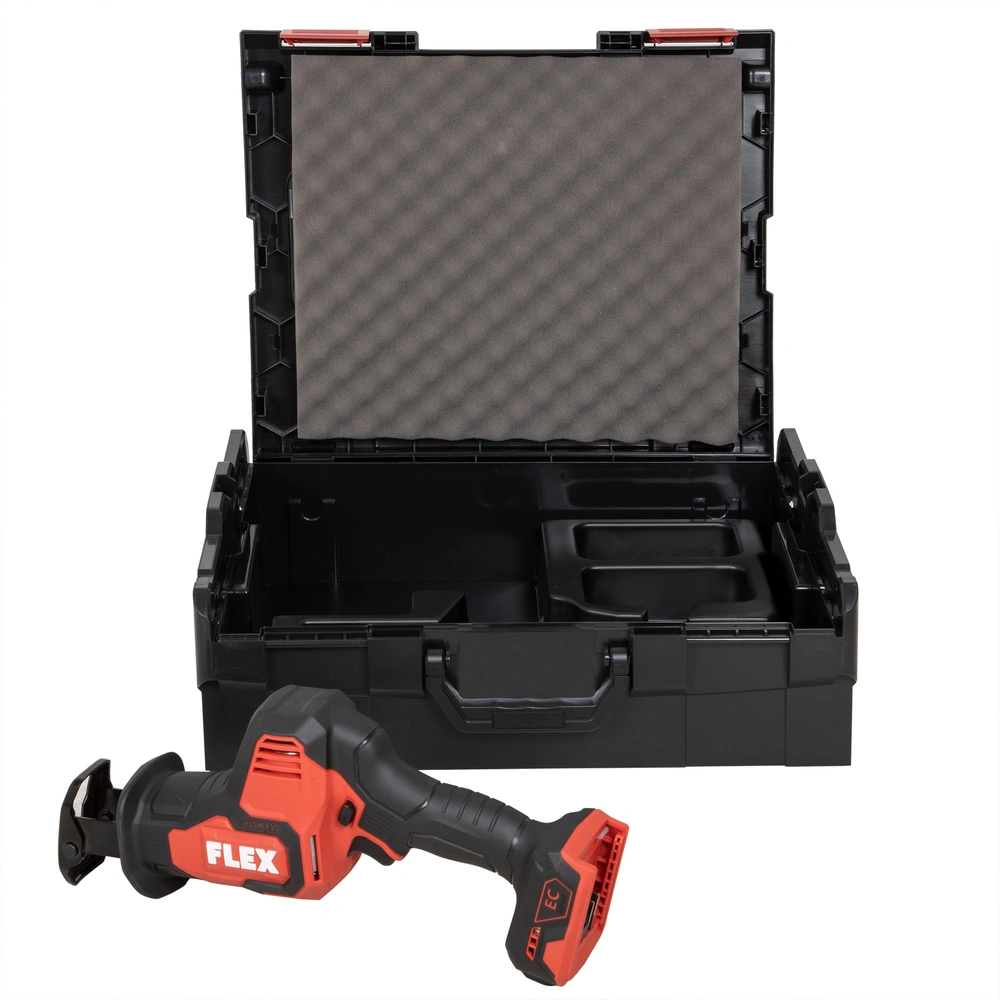 Battery-operated reciprocating saw with brushless, powerful motor. The twin-bearing lifting rod guide with vibration balancing allows for fatigue-free working. The universal saw blade holder with ejection function ensures simple and toolfree saw blade change. The saw blade can be turned through 180°. The swivel saw support optimally adapts to the workpiece. The tool is equipped with the Electronic Management System (EMS) that protects the machine and ensures a long service life and high efficiency. Additionally, the saw is provided with an LED-type, cordless capacity display, an accelerator switch abnd integrated LED lamp with afterglow function. The reciprocating saw can be operated with all FLEX 18V battery packs and is supplied in the practical L-BOXX®.