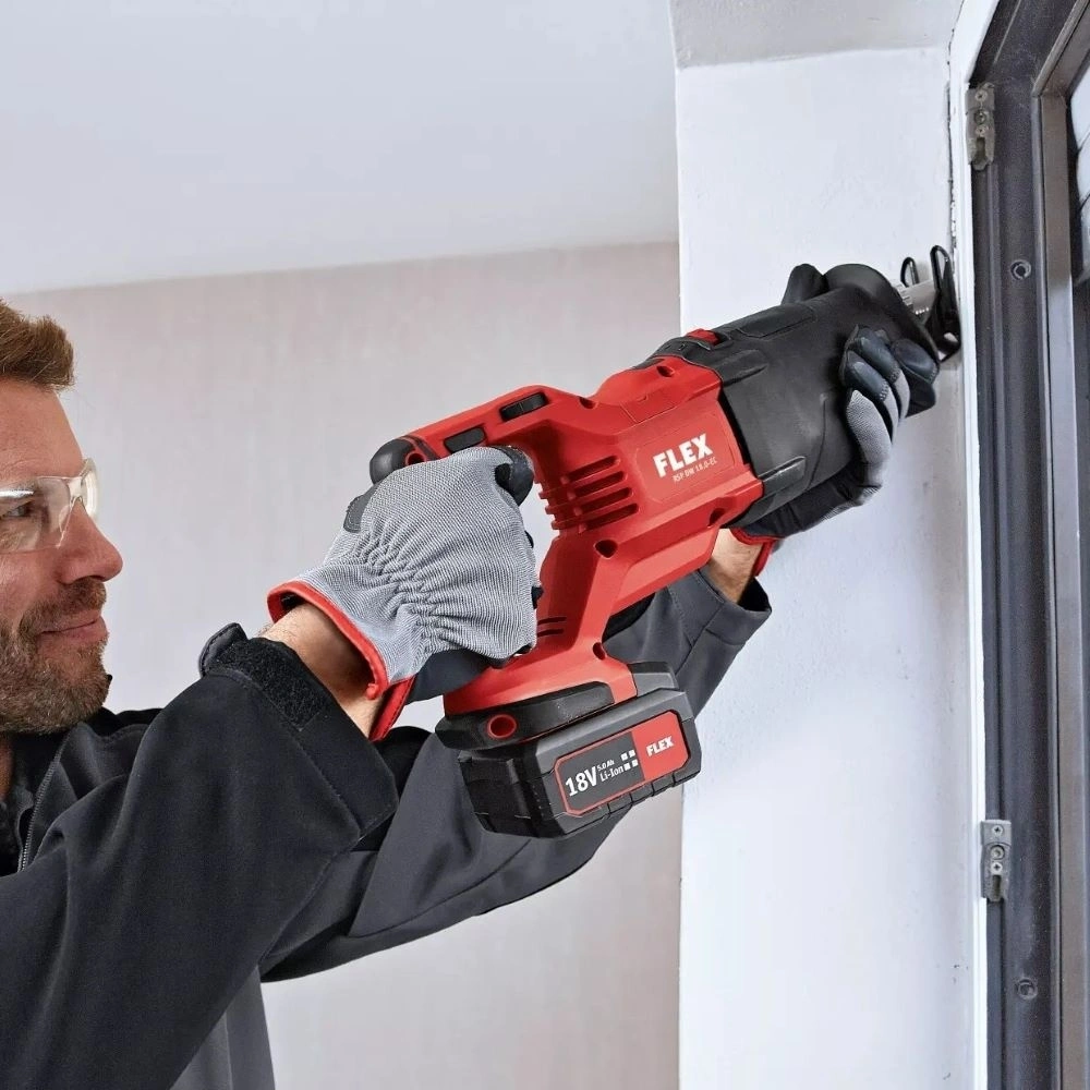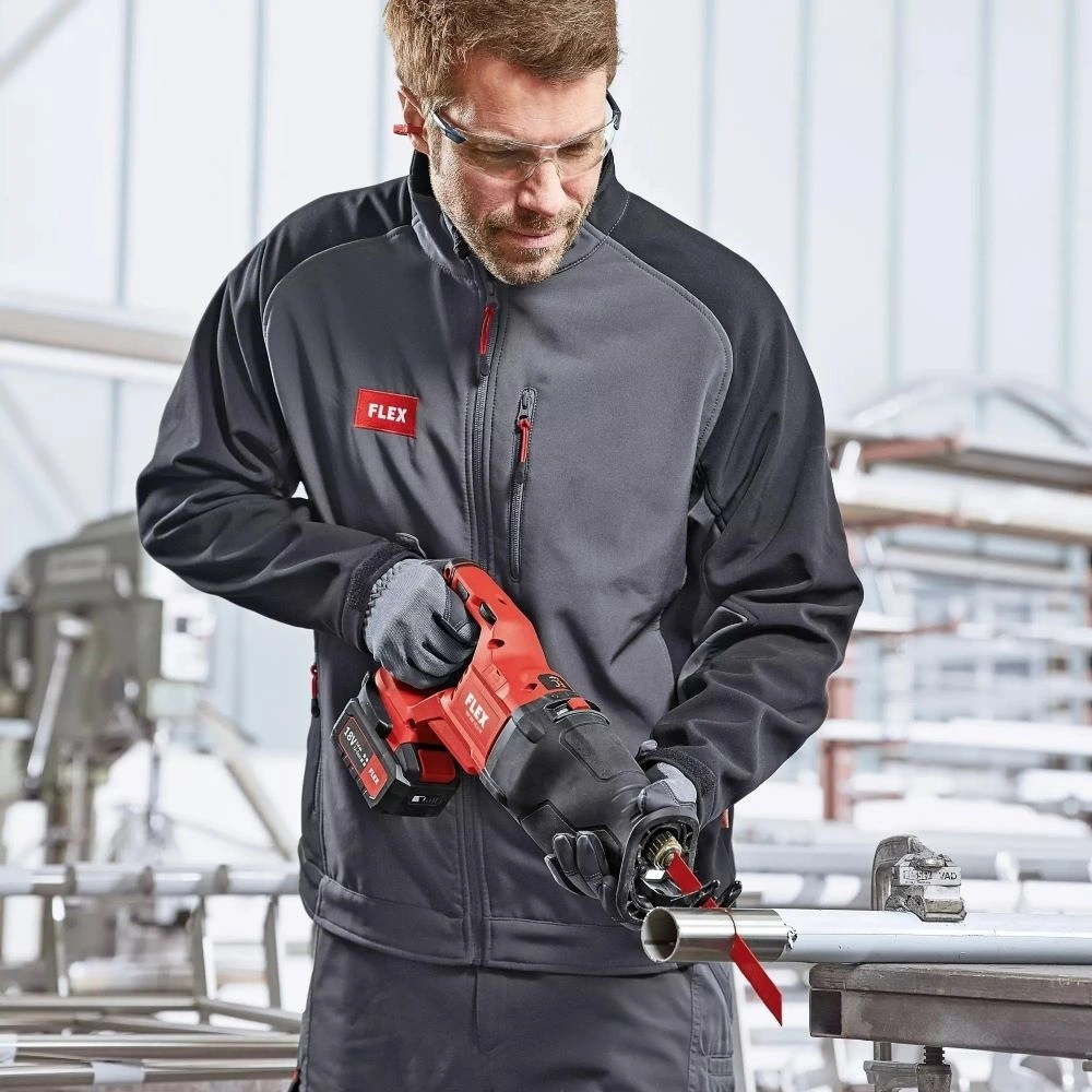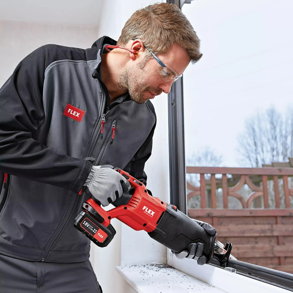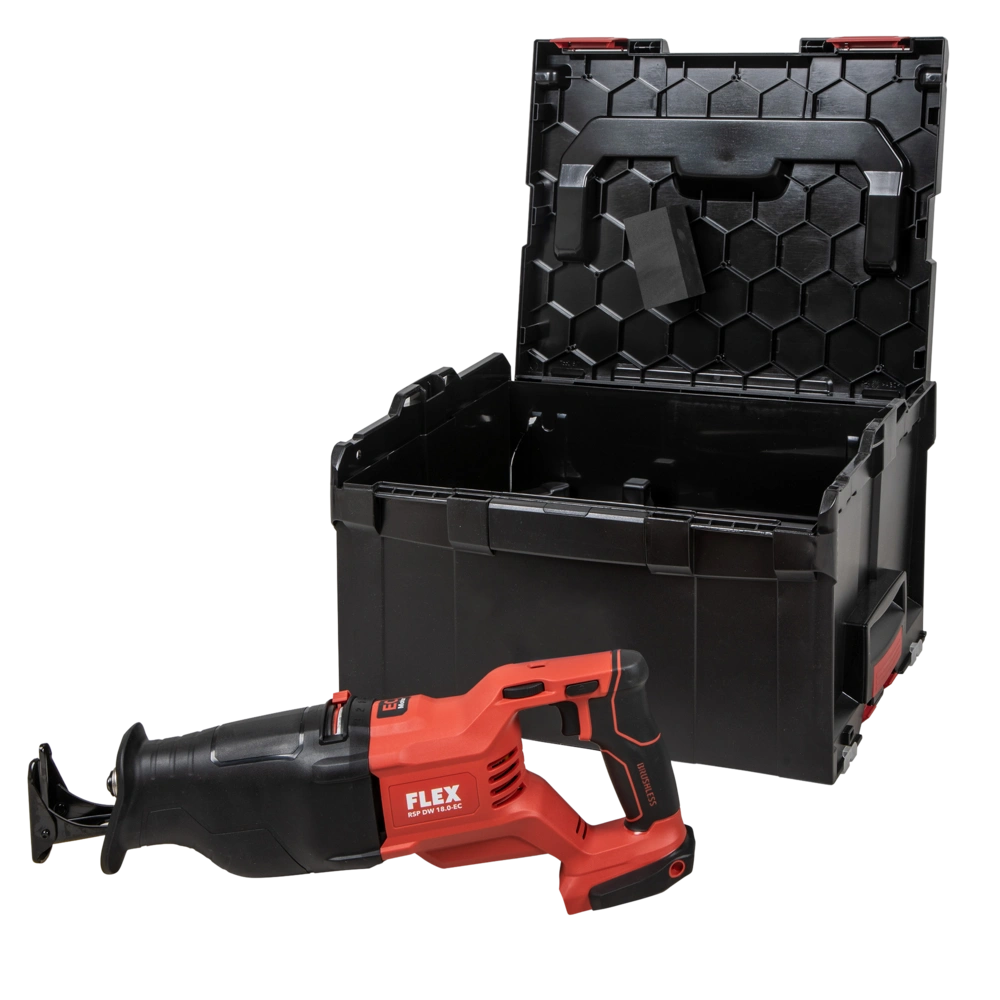 The reciprocating saw can be operated with all FLEX 18V battery packs and is supplied in the practical L-BOXX®.