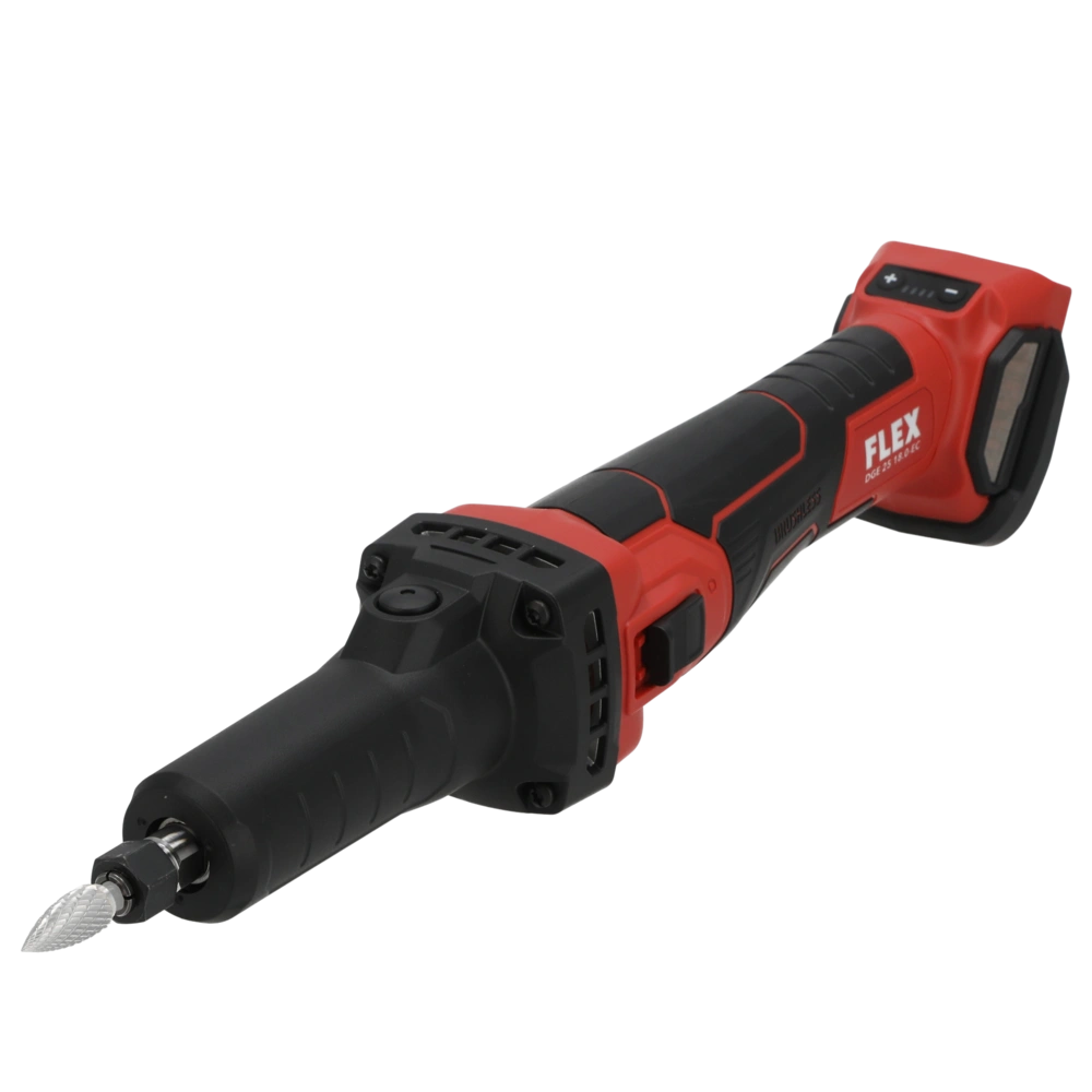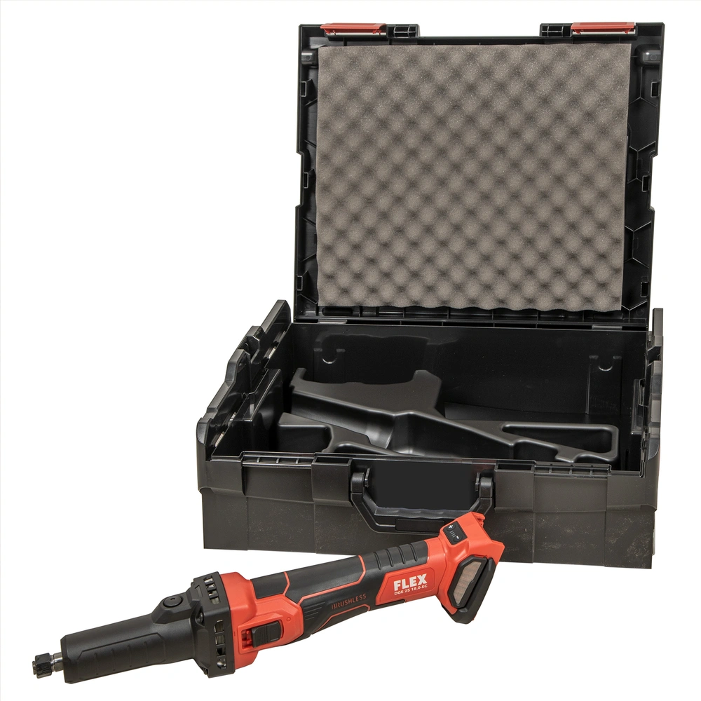 The straight sander can be operated with all FLEX 18V battery packs and is supplied including collet and open-end spanner in the practical L-BOXX®.