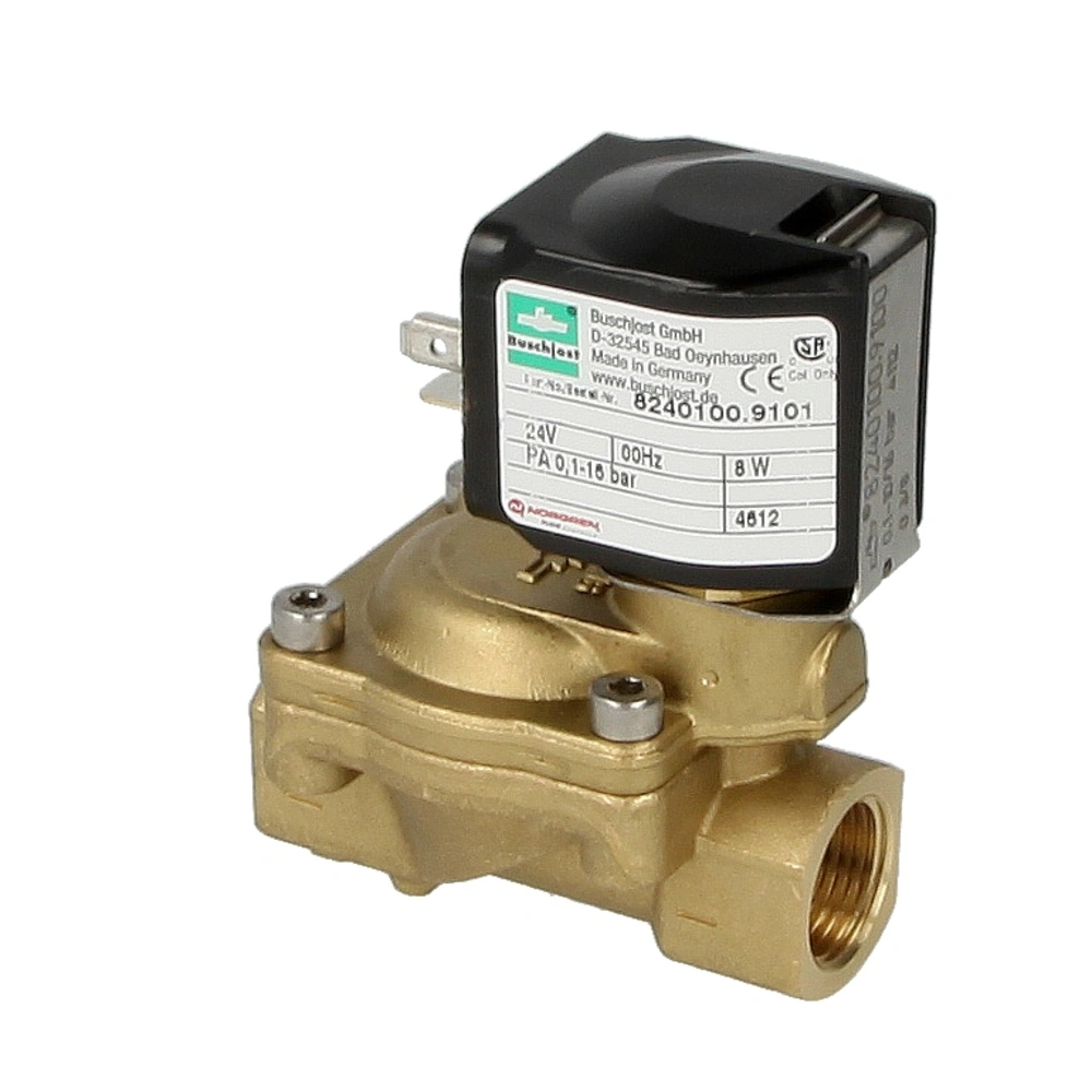 Compact solenoid valve with closing damping and NBR seal for air, water and neutral gases. The valve is actutated indirectly and requires only minimal differential pressure for opening. It provides a large flow rate, is pressure-resistant and has a lower power consumption than directly actuated solenoid valves.