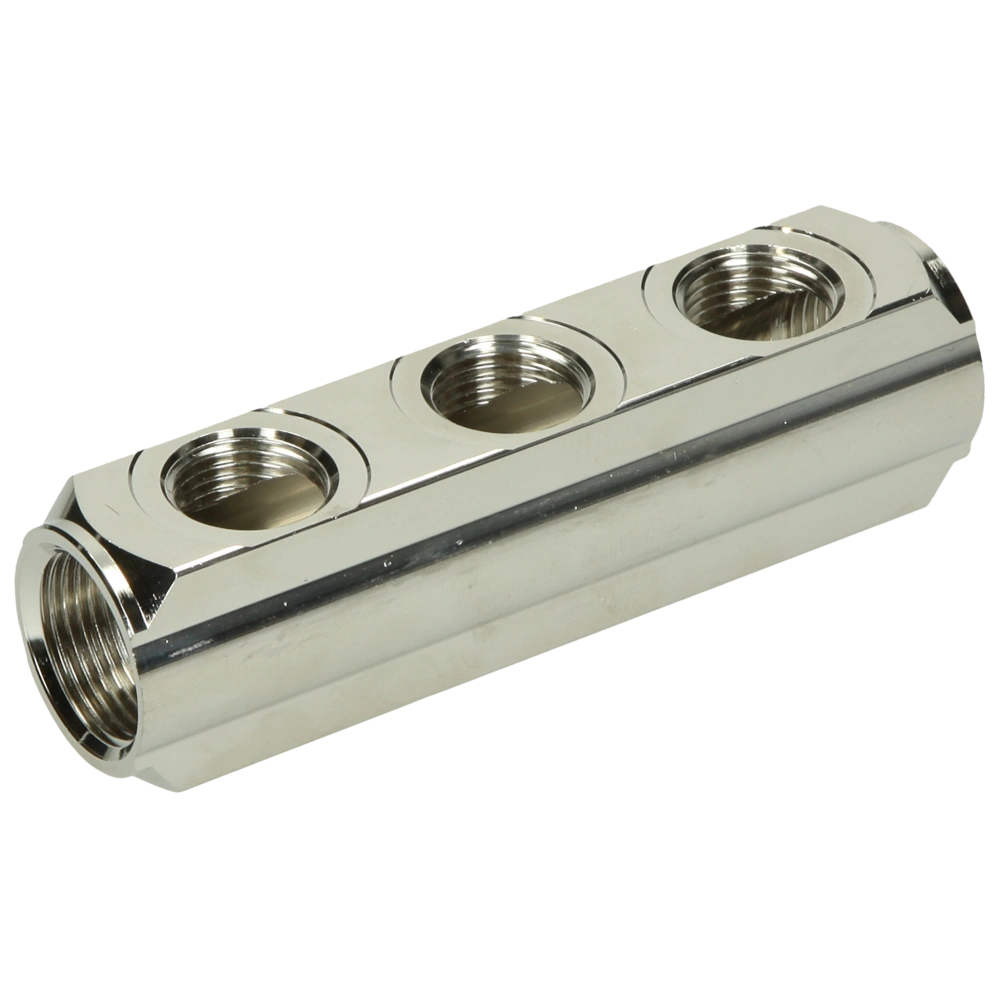Brass manifold for the connection of copper pipes, PEX, polybutylene and metal composite pipes.