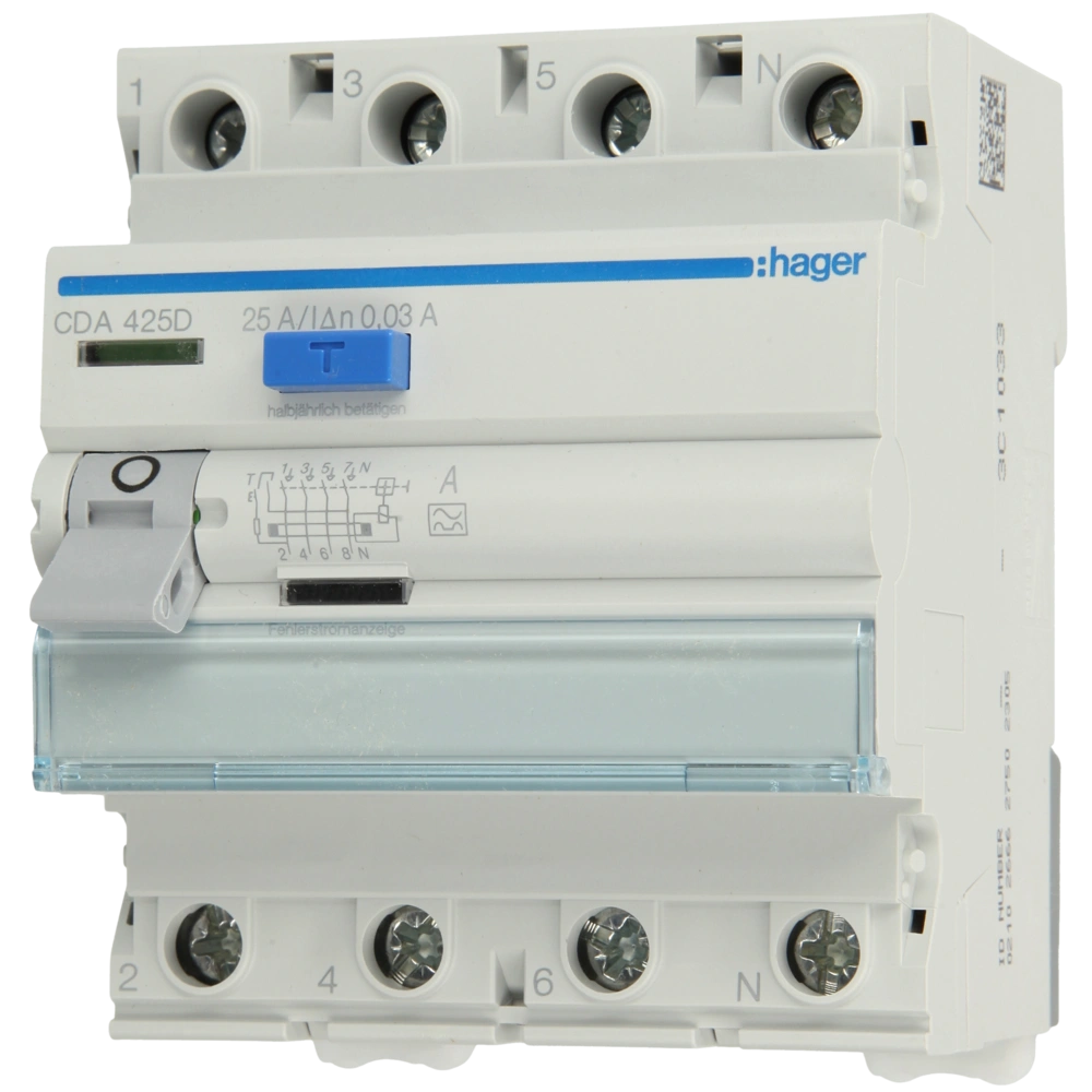 4-pole RCCB of type A for automatic disconnection of electrical circuits as soon as the permissible residual current is exceeded and for the protection against life-threatening situations caused by insulation faults or dangerous contact voltage.