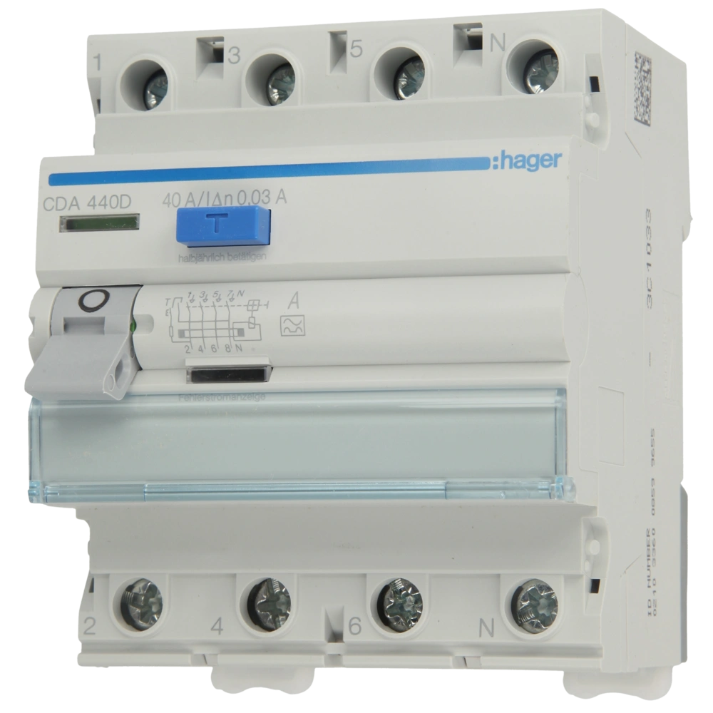 4-pole RCCB of type A for automatic disconnection of electrical circuits as soon as the permissible residual current is exceeded and for the protection against life-threatening situations caused by insulation faults or dangerous contact voltage.