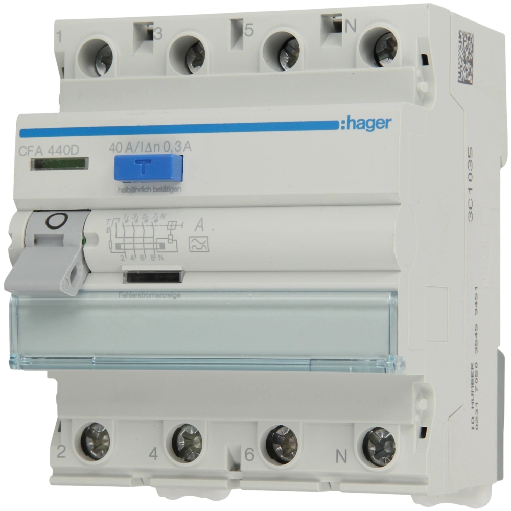 4-pole RCCB of type A for automatic disconnection of electrical circuits as soon as the permissible residual current is exceeded and for the protection against life-threatening situations caused by insulation faults or dangerous contact voltage.