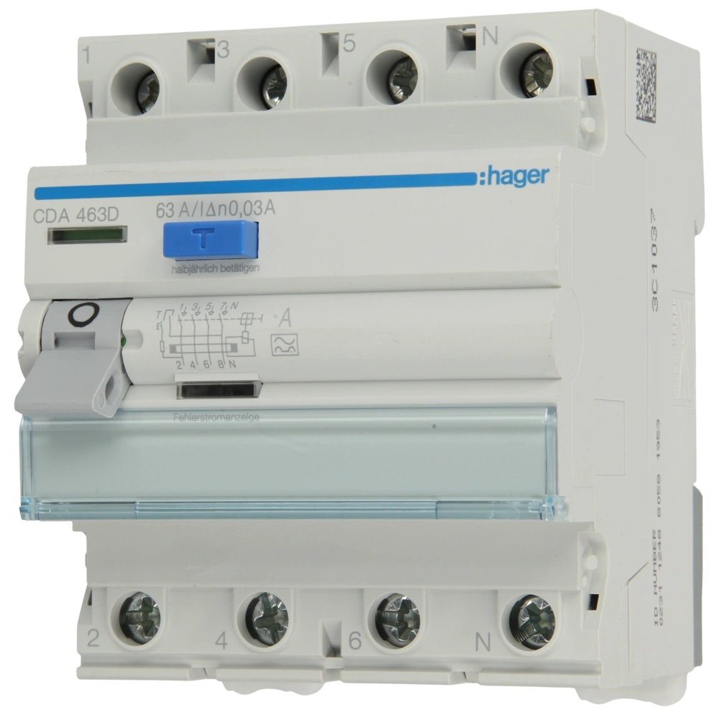 4-pole RCCB of type A for automatic disconnection of electrical circuits as soon as the permissible residual current is exceeded and for the protection against life-threatening situations caused by insulation faults or dangerous contact voltage.