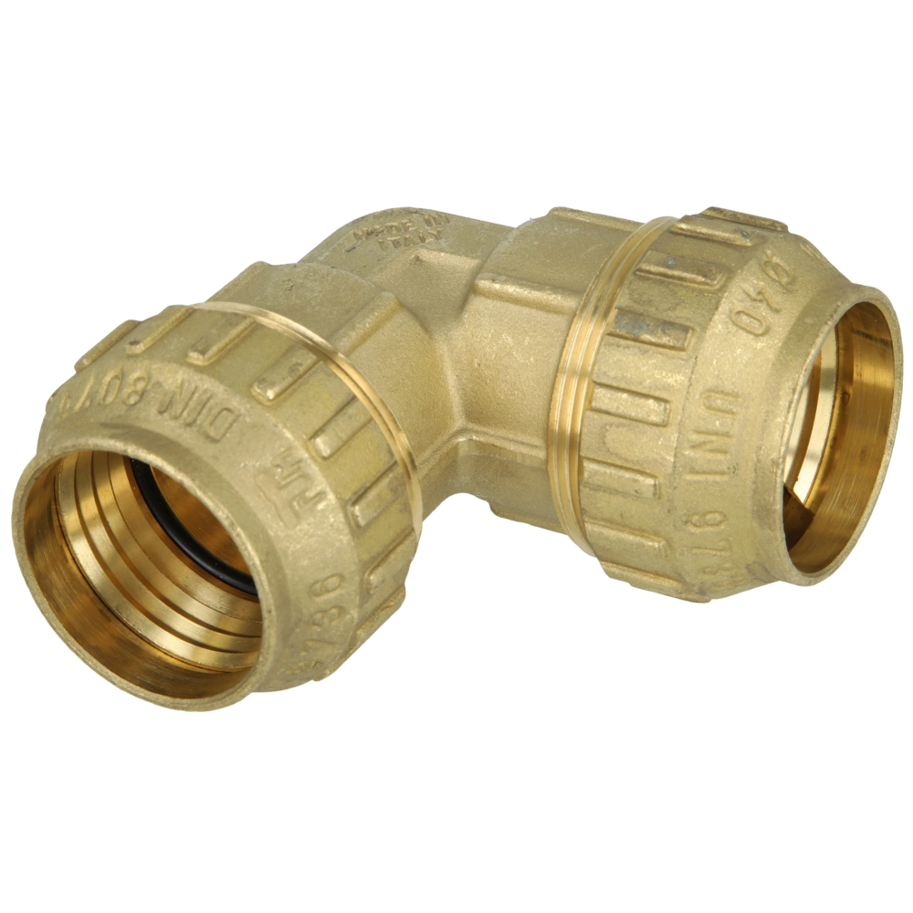 Brass compression fitting with brass compression ring for the connection of PE pipes in drinking water installations.