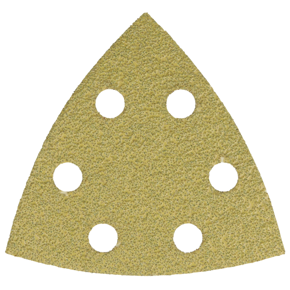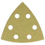 Universal abrasive triangle with 6 holes on a 52 mm radius for wet and dry sanding of paint and lacquers. The adhesive has a flexible, latex paper backing for perfect adaptability to the workpiece surfaces. Increased sanding time due to the optimised abrasive grain coating in combination with a special anti-clogging system.