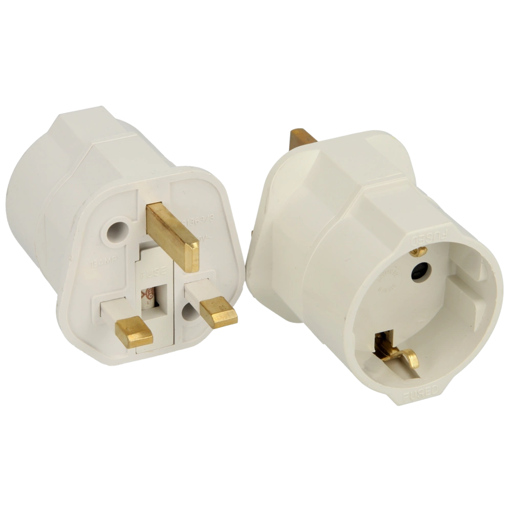 Adapter for converting type G sockets into type F sockets, 3 pole safety plug,
