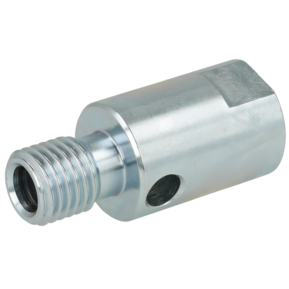 Adaptor for core drills with M16 female thread shank, which are to be inserted on a machine with a 1/2" -20 UNF male thread connection. When the adaptor is being screwed tight, the through-hole on the side serves as counter aid...