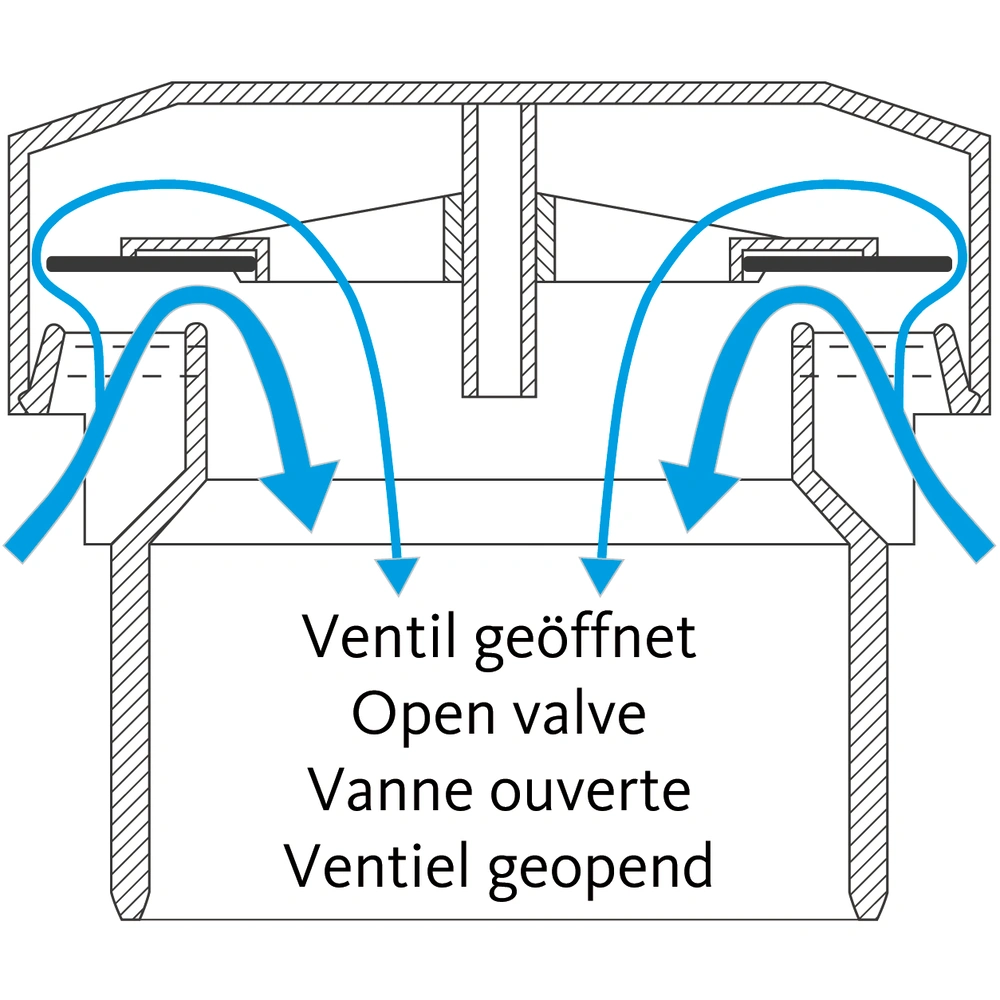 If the air admittance valve is installed in the discharge pipe, its diaphragm opens as soon as there is a vacuum. Due to the fresh air flowing into the discharge pipe, the negative pressure there is equalised, before the water is sucked out of the water trap. The valve is absolutely tight in the opposite direction. The air admittance valve is to be fitted vertically onto the wastewater pipe. It can be installed in an intermediate ceiling, in the attic, below the basin or in a ventilated wall-panel element.