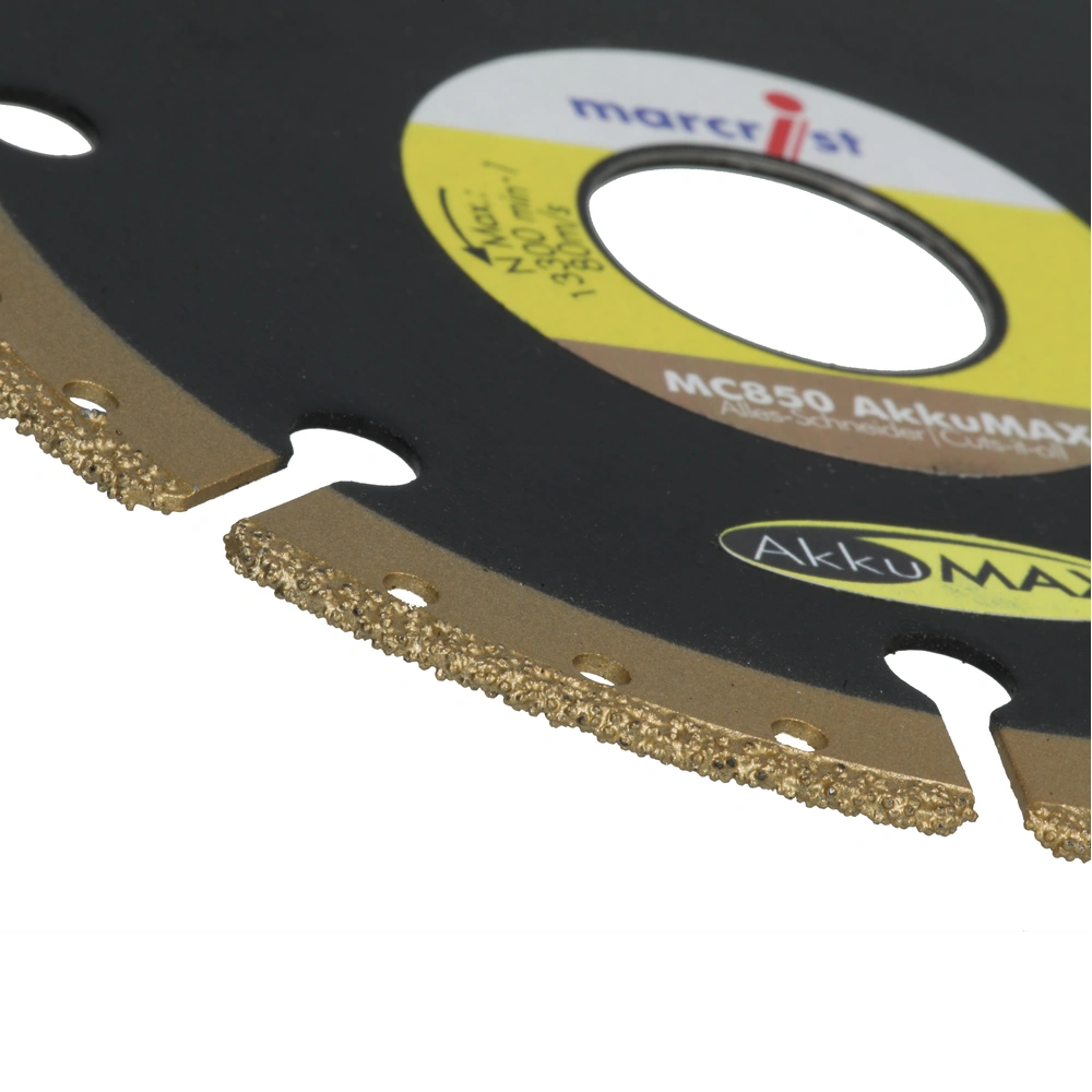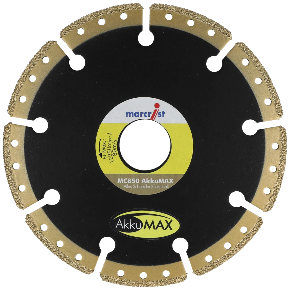 AkkuMAX diamond cutting blade for concrete, stone, plastic, natural stone, steel, wood with nails, cast iron, copper and profile sheets with an ultra-thin cutting edge, which cuts extremely fast and is intended to be used with cordless tools. It cuts more efficiently than any other cutting blade. It is noise-reducing, vibration-reduced and has a vacuum-brazed core. The blade stands out for high safety and side stability. The self-cooling property ensures that there is no need for a cooling break.