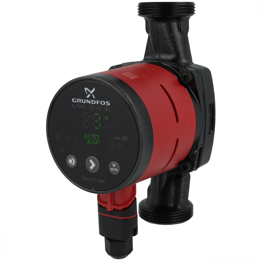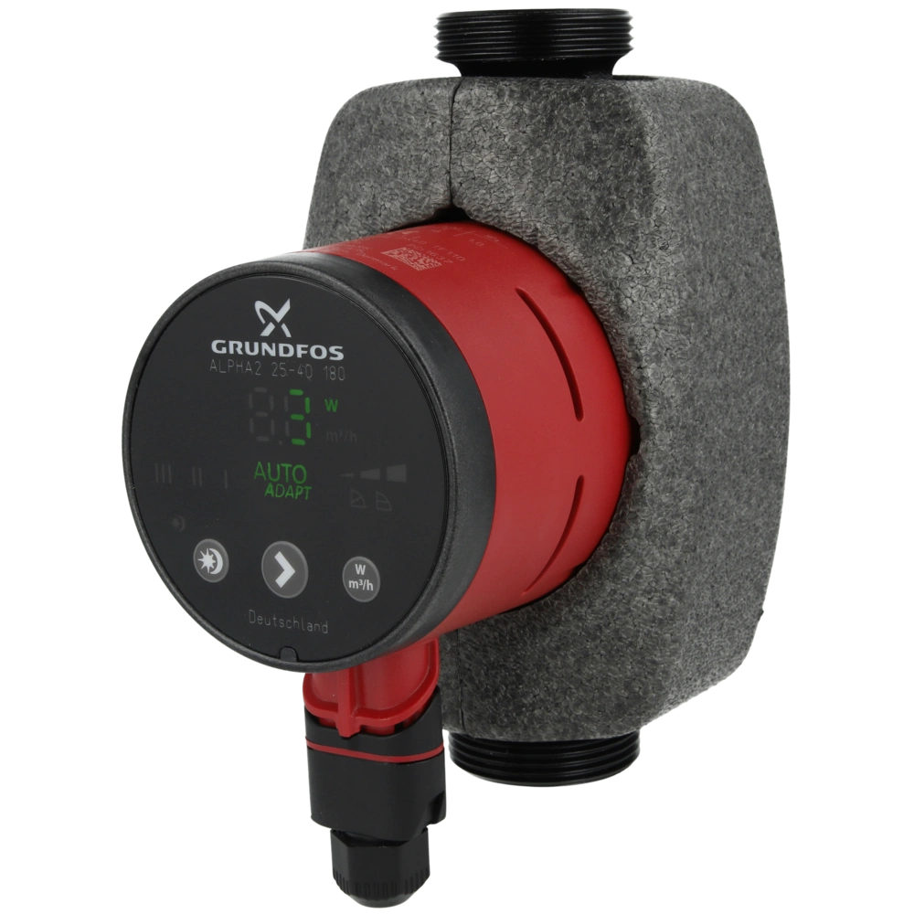 Highly efficient circulation pump with electronic power adaptation. Ideal for heating and air-conditioning systems. An Auto-adapt function simplifies the start-up and subsequently ensures the permanent optimisation of the pump curve. The clear display can be operated intuitively. The permanent-magnet motor of the pump is current-proof, quiet and energy-saving. The optionally available ALPHA READY adapter and the free Go Balance App can be used to balance the connected radiators hydraulically. High-quality materials and precise manufacturing make this pump extremely durable.