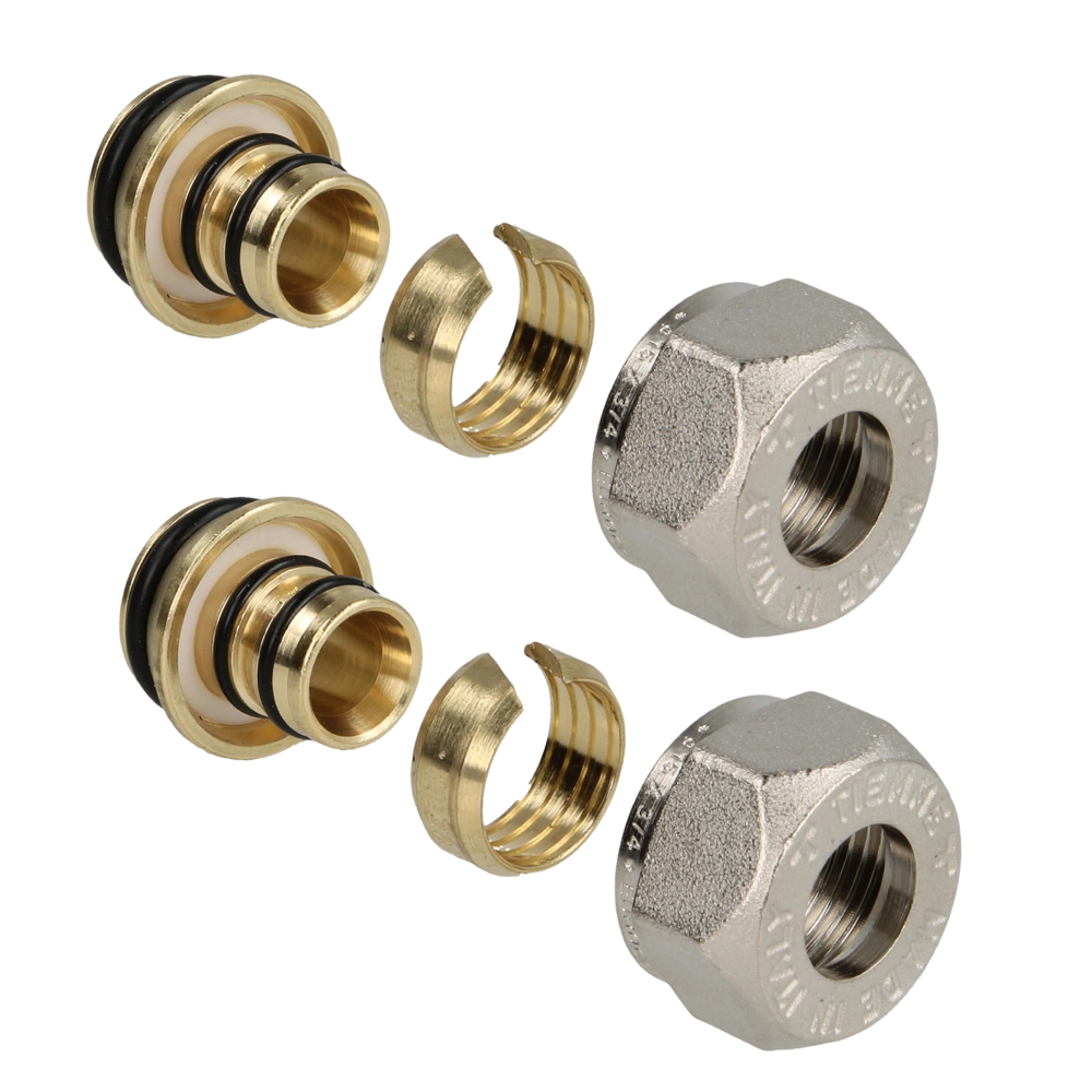 Brass compression fitting 20 x 2.25 for aluminium multi-layer pipe for the connection to male valve threads G 3/4". Nickel-plated. Packaging unit: 2 pieces.