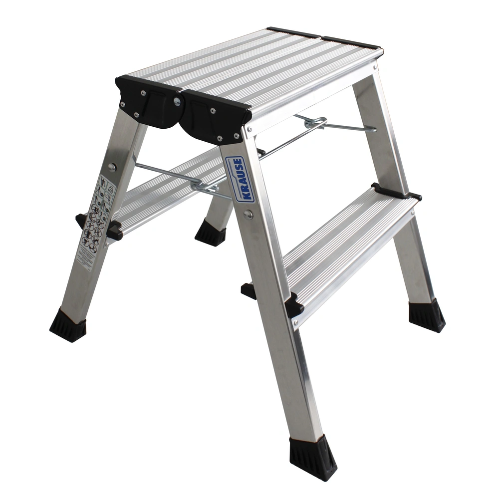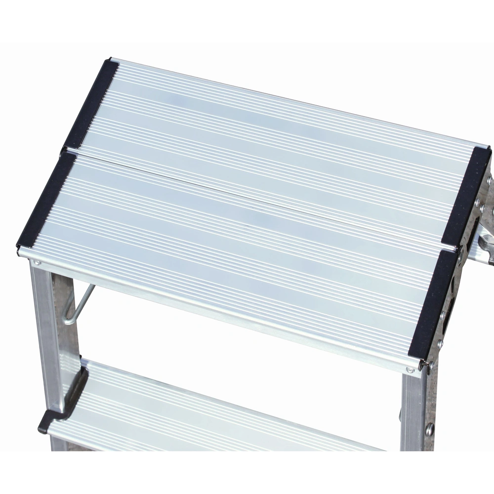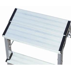 The lightweight and handy double-sided aluminium folding step is GS tested, can be climbed from both sides and provides a large top platform of 200 x 350 mm. It is provided with a roll/stop function.