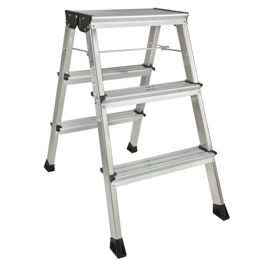 The lightweight and handy double-sided aluminium folding step has the GS-mark, can be climbed from both sides and provides a large top platform of 200 x 350 mm. It is provided with a roll/stop function.