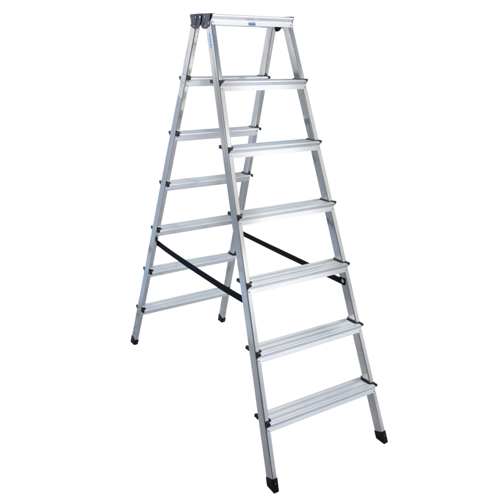 The stable and handy aluminium double-sided step ladder can be climbed from both sides and is fitted with two safety belts and anti-slip foot caps. It can be folded and stored in smallest corners for space-saving reasons. The step/frame connections are multiply riveted and therefore particularly stable. The ladder is ideal for universal use in the craft sector.