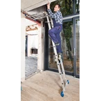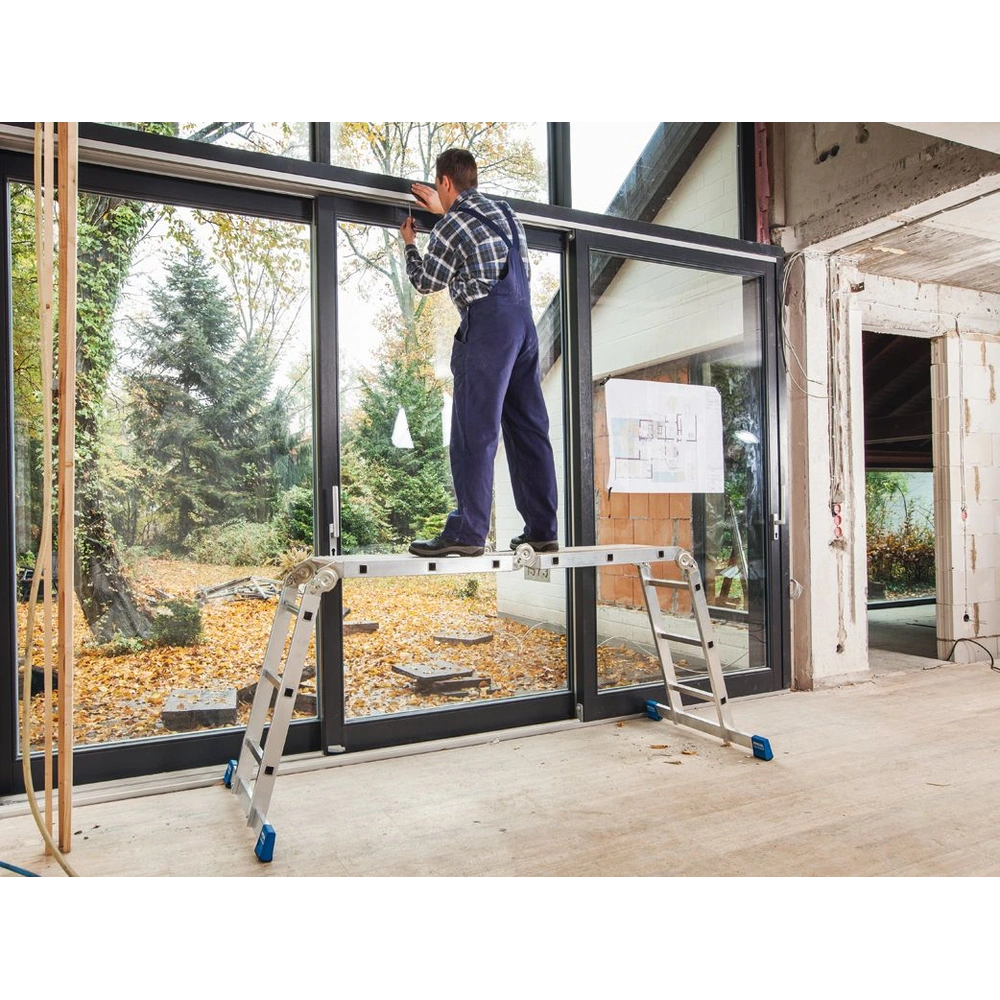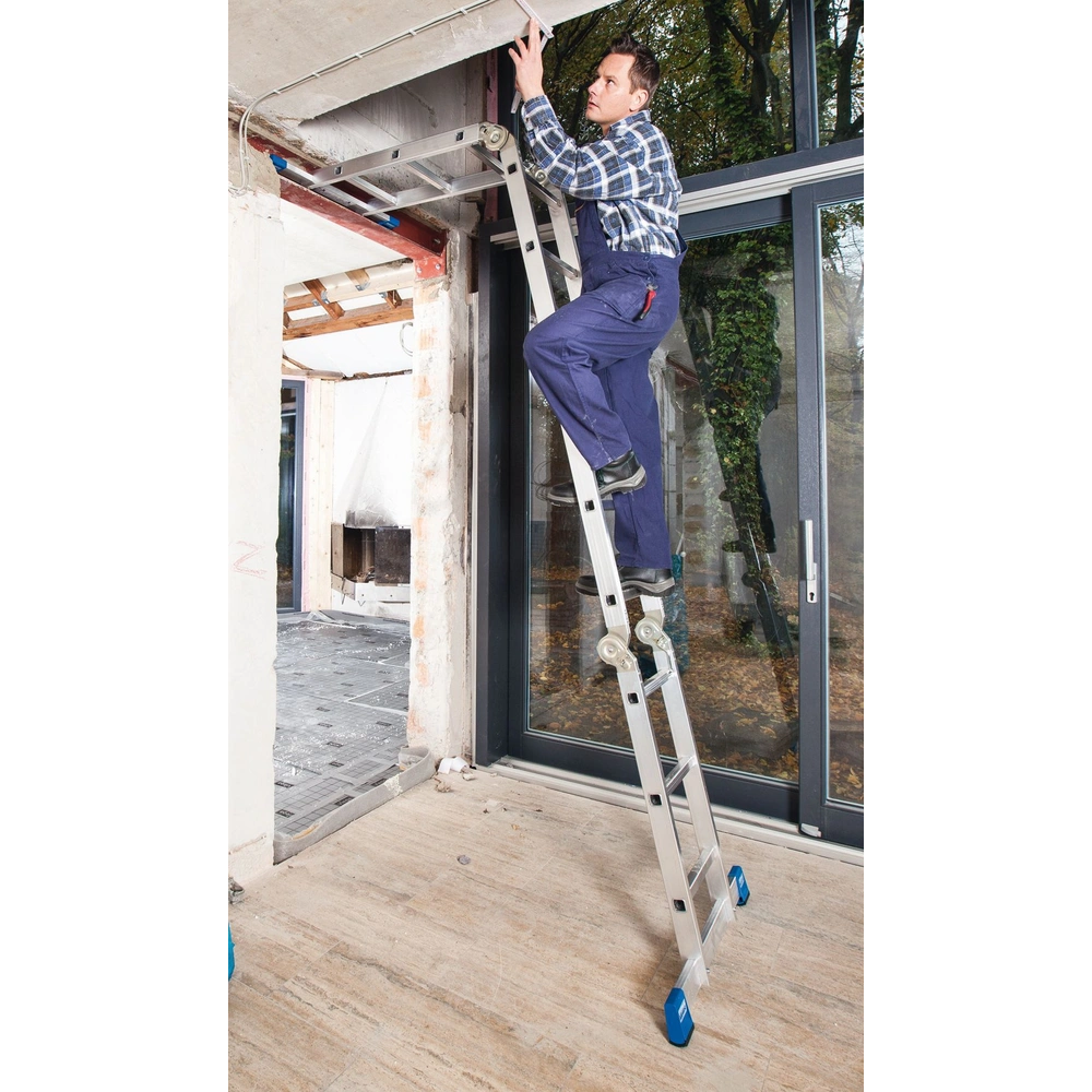 The high-quality, 4-piece aluminium jointed ladder can be used as lean-to, free-standing double ladder or as work platform. The patented safety joint system with one-hand operation lever ensures quick and safe function of the ladder by simultaneous unlatching of both joints with just one hand. Quick and easy to store, even in the boot of your car. The rails made of aluminium press profiles are fitted with additional material reinforcements where most wear applies, in order to ensure a high profile rigidity.