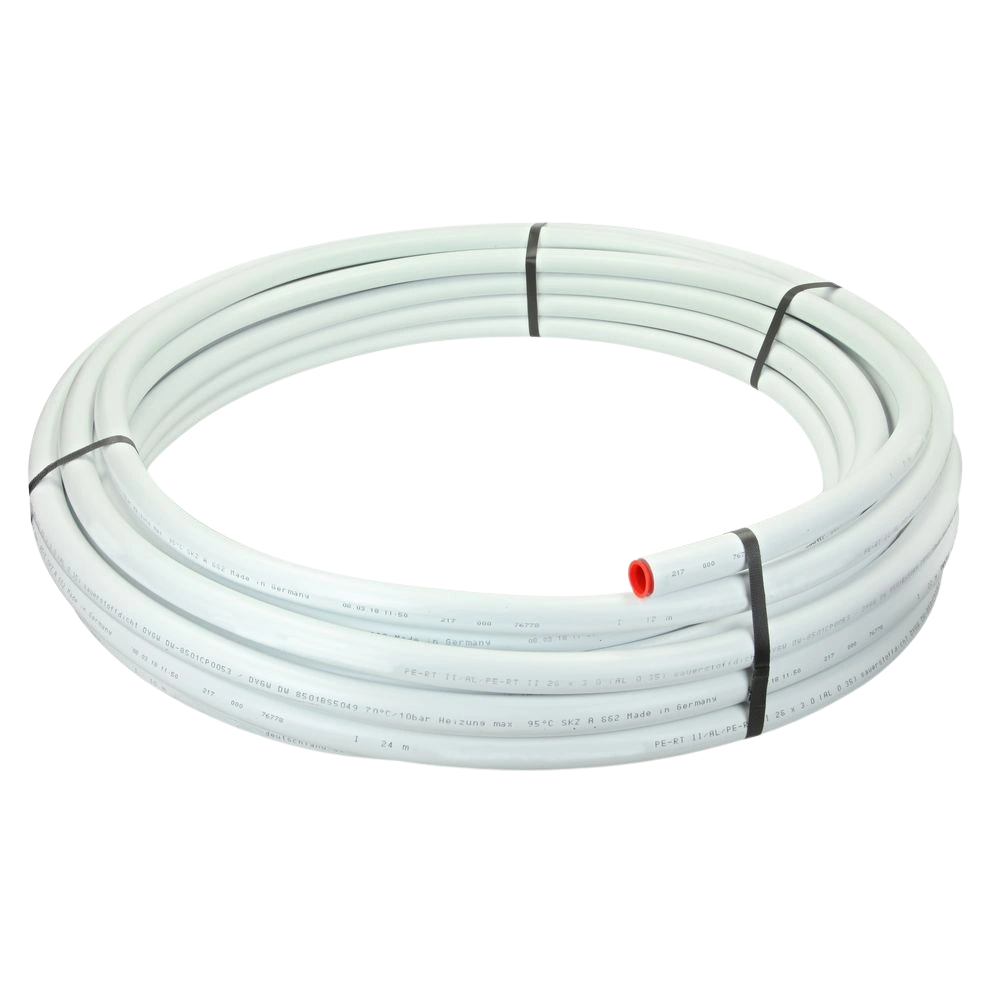 It consists of an extruded basic polyethylene pipe with aluminium jacket covered with a layer of white polyethylene for protection. This dimensionally stable, highly temperature- and pressure-resistant joint can be easily bent by hand and remains in the desired shape without springback.
