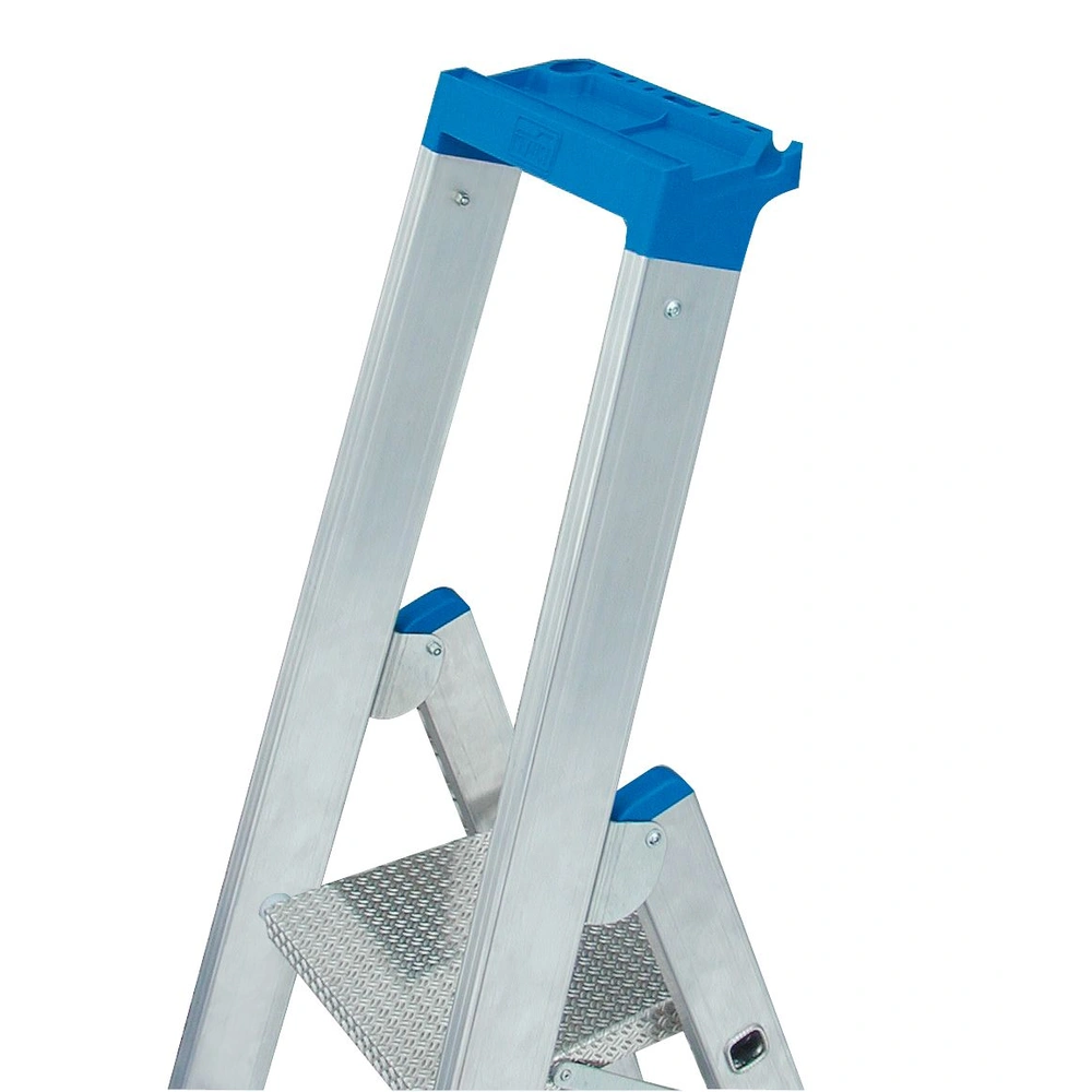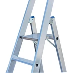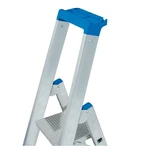 The aluminium standing ladder can be ascended from one side. It is fitted with high-strength braced step/side rail connections for a long service life and permanent professional use. The 2-component foot plugs ensure a safe stand and additional corner bracings at the lower step provide even more stability. It is fitted with a safety top rail with screwed-on tool tray and integrated bucket hook.