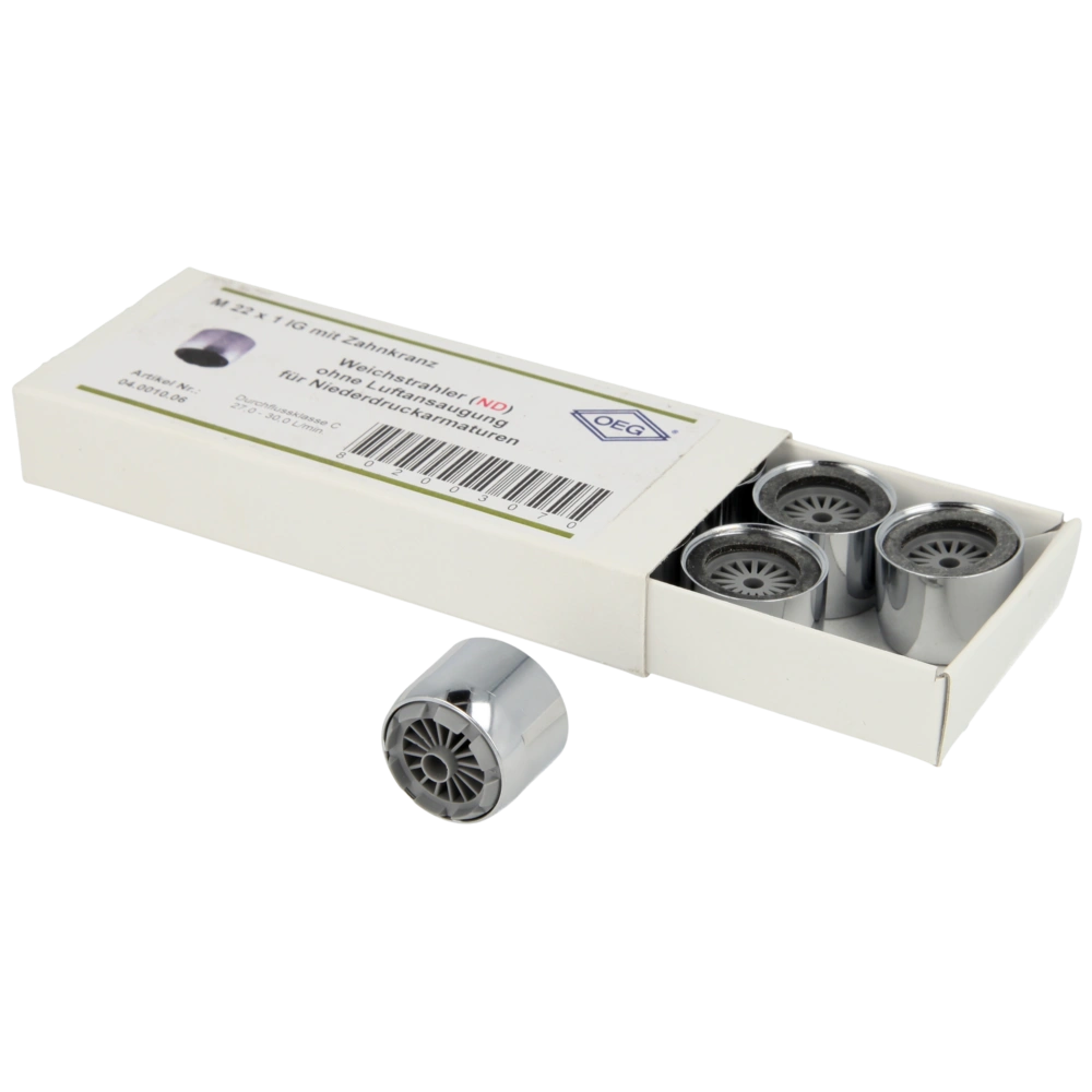 All product information Scope of deliveryLow-pressure, anti-block flow controller with full flow rate for the use in customary low-pressure systems. The gear rim facilitates the replacement of the flow controller. The design provides for an even and splash-free water stream.