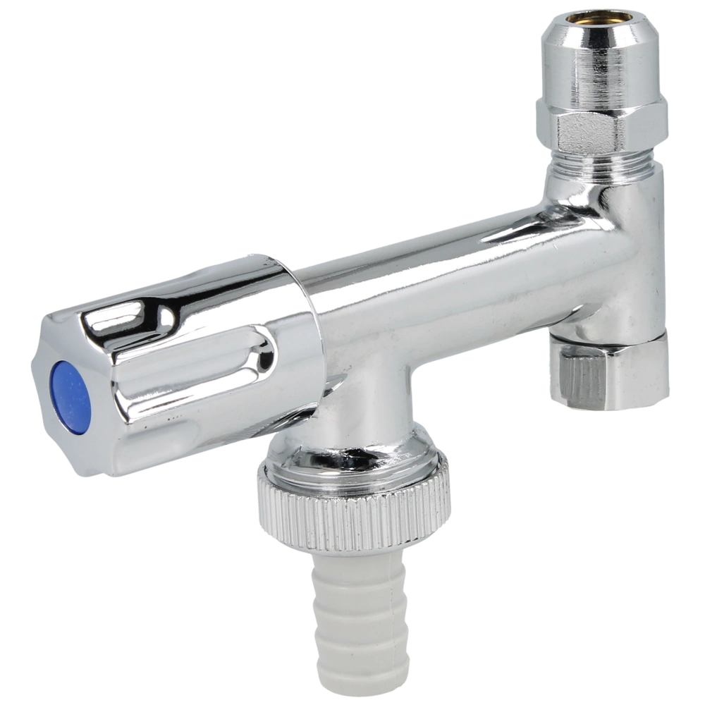 The appliance auxiliary valve is equipped with a compression fitting with length adapter, a hose screw connection and an integrated backflow preventer.