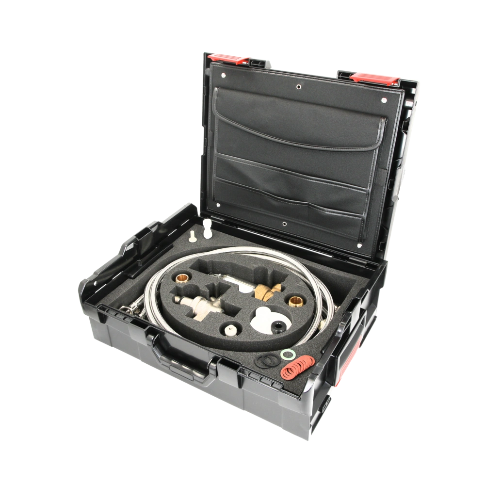 AQA therm MOVE CASE connection kit for mobile BWT heating water treatment AQA therm MOVE Mobile heating filling system. The case contains all required components like filling unit, filter, adapter and connection hoses for the mobile reverse osmosis.