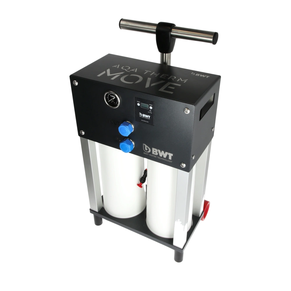 Mobile preparation system for heating water acc. to VDI 2035. Harmful hardeners and oxygen are removed. Electrical conductivity is reduced at the same time. AQA therm MOVE does not require any additional exchanger resins! This results in significantly lower subsequent costs compared to conventional systems. Being small and compact, any system can be filled by means of the 821001128.