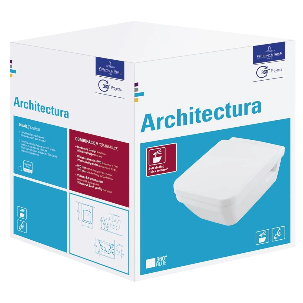 The Villeroy & Boch Architectura Combi-Pack with CeramicPlus surface finish consists of a washdown wall-mounted toilet with horizontal outlet, an open flush rim (DirectFlush) and the water-saving AQUAREDUCT® system as well as a toilet seat with QuickRelease and SoftClosing function.