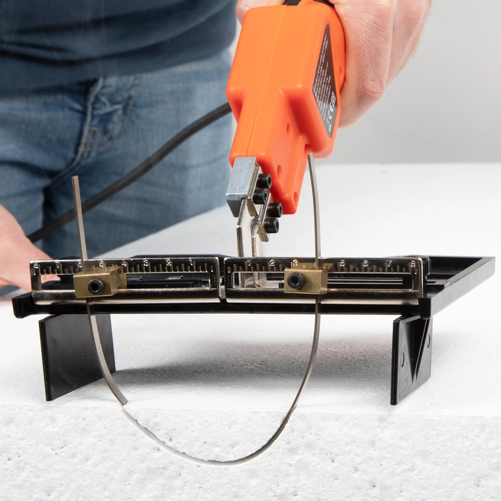 The flexible blade with adjustable radius heats up to the temperature set at the handle of the styrofoam cutter within seconds.
