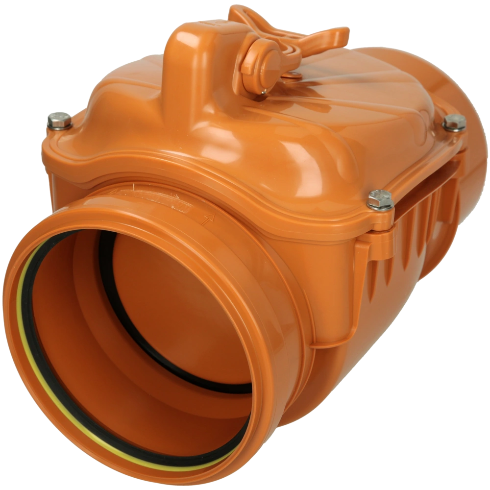 Backwater valve for horizontal installation in pipes for faecal-free wastewater. The valve is equipped with an additional manual lock, rodent protection and an automatically closing flap. The backwater valve and all fixing elements are made of stainless steel.