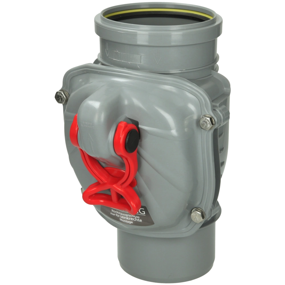 Backwater valve for vertical installation to pipes for faecal-free wastewater. It protects the building against floodings with rainwater from the sewage system by automatic closing. The additional manual lock provides for an emergency closure.