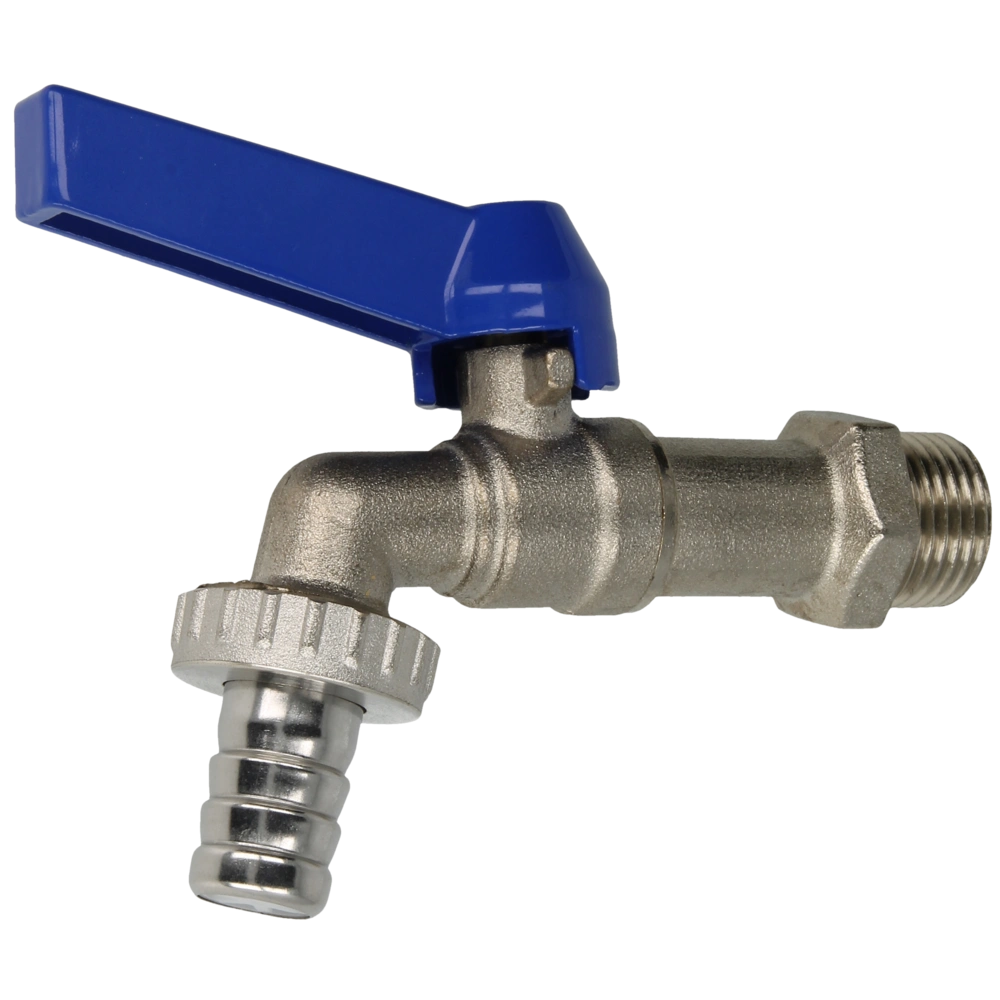 The ball tap valve is provided with a blue aluminium diecast lever and a hose screw connection. It is used for sanitary installations.