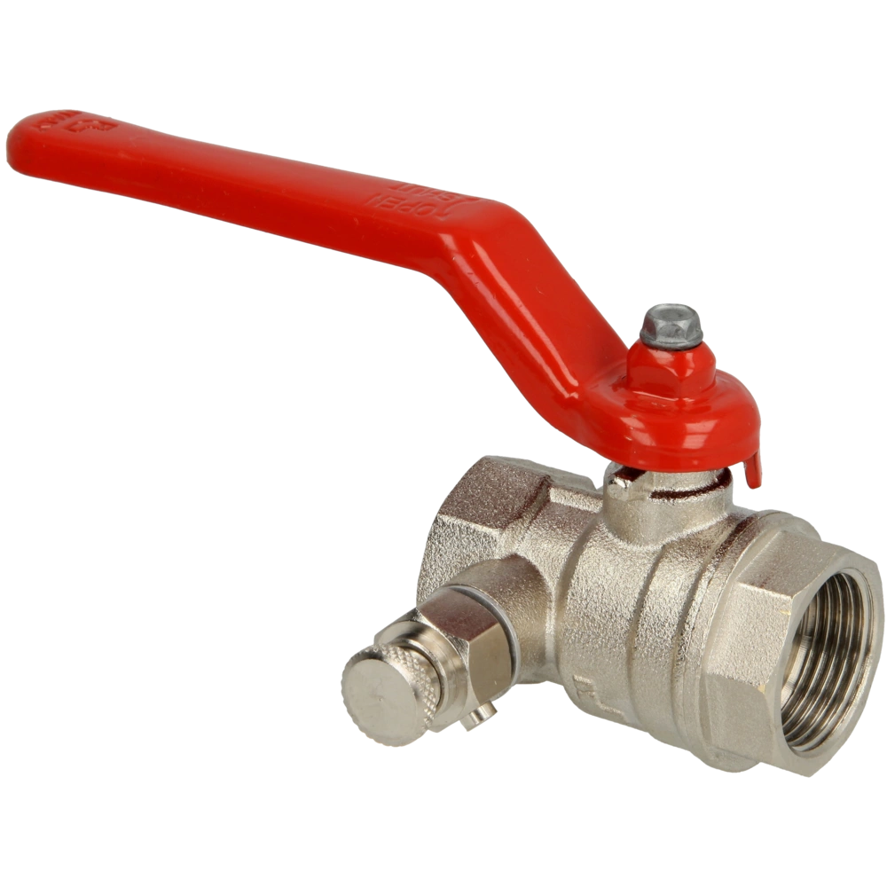 Ball valve with draining and red steel lever suitable for water supply, heating or air-conditioning systems.